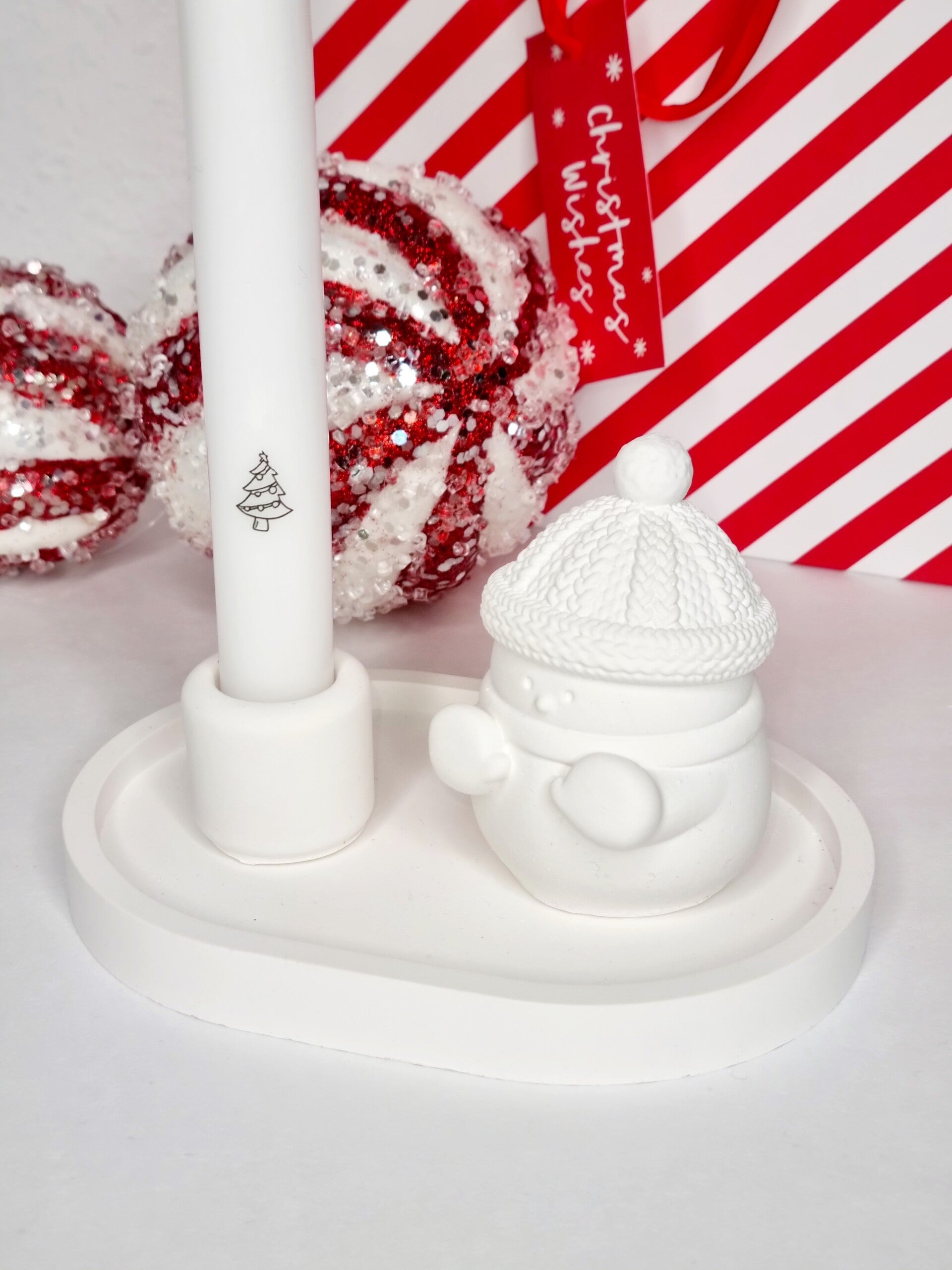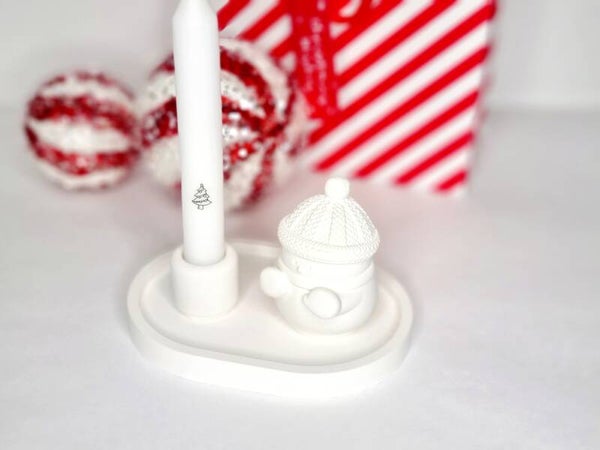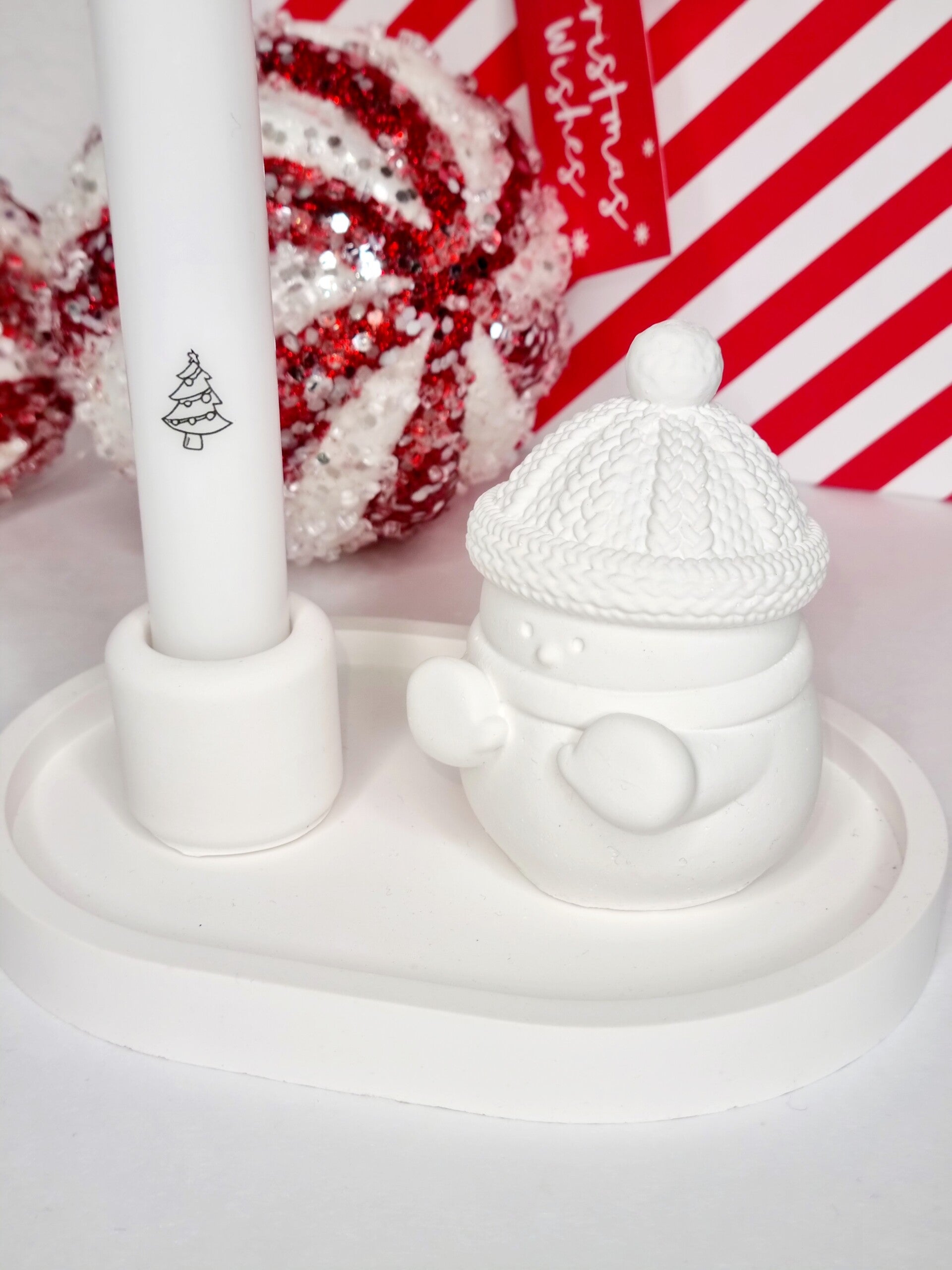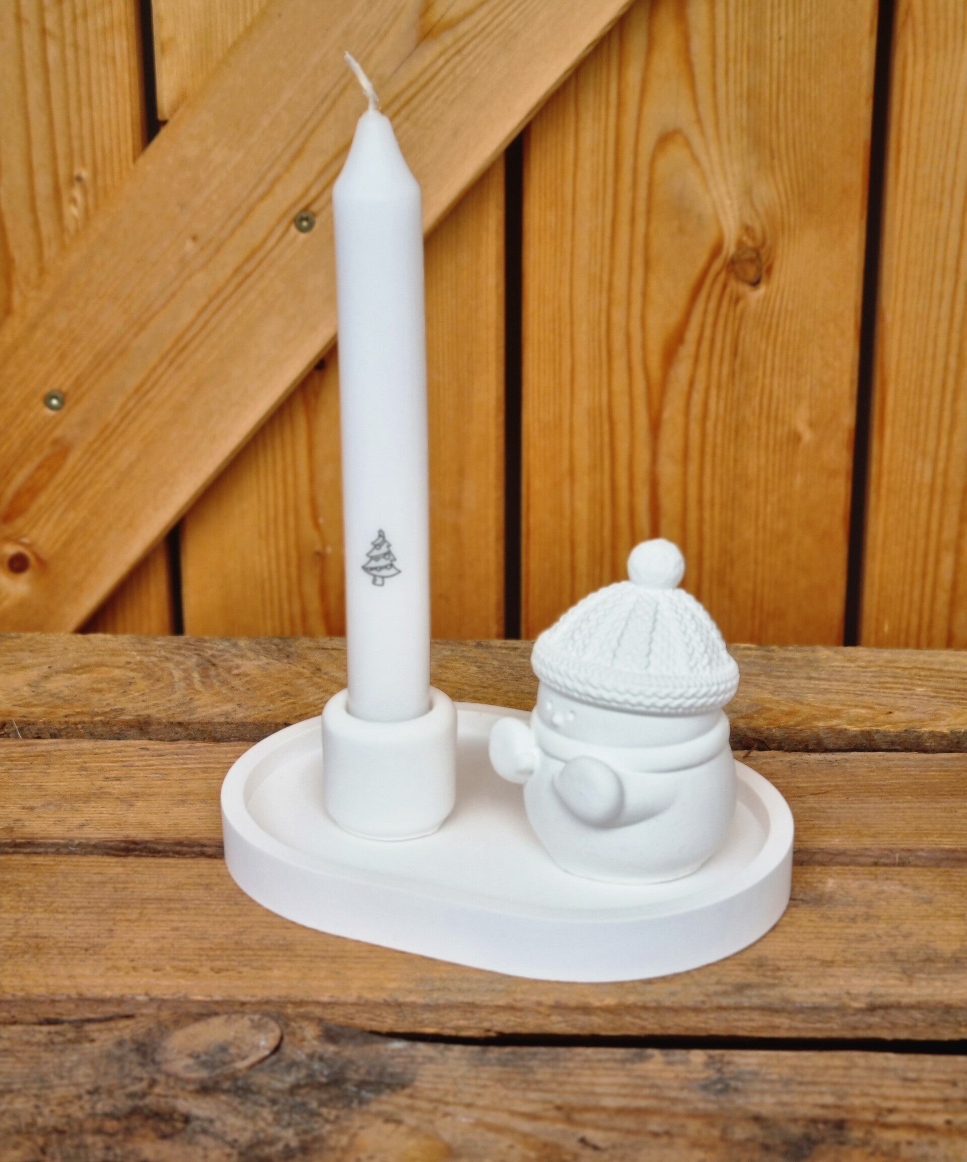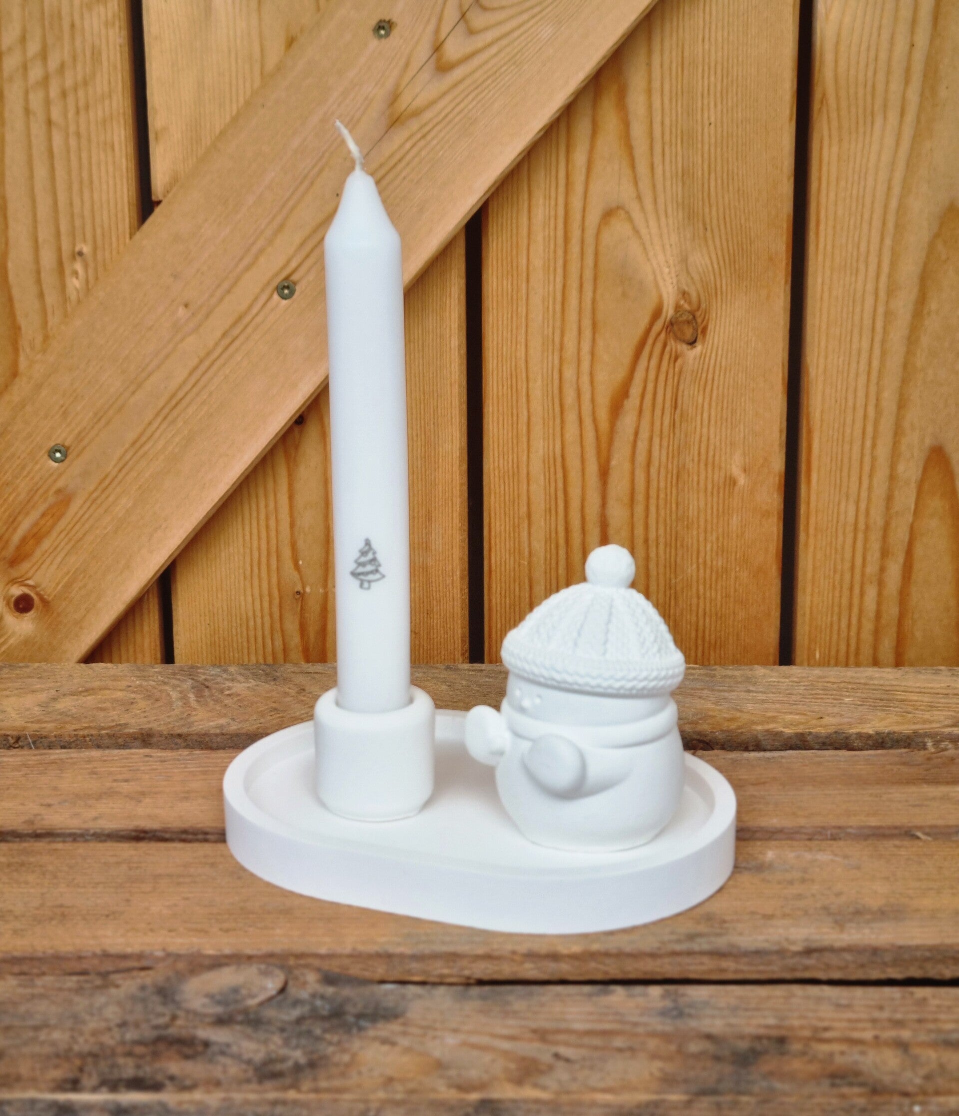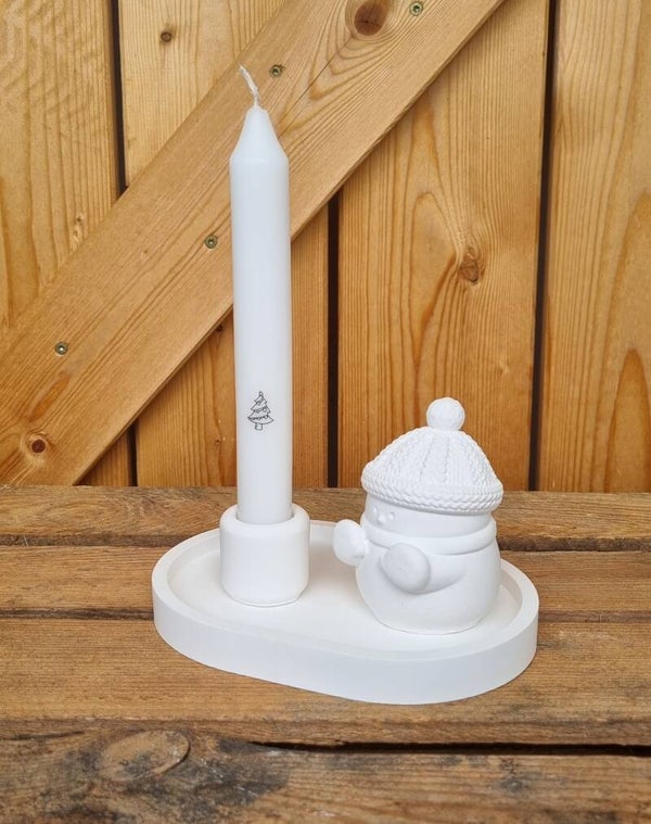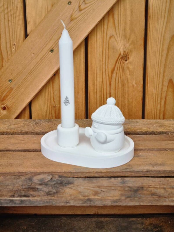 Ein Arrangement aus einer Weihnahts Kerze mit Halter, einem besonders süßen Schneeman auf einem Tablet.