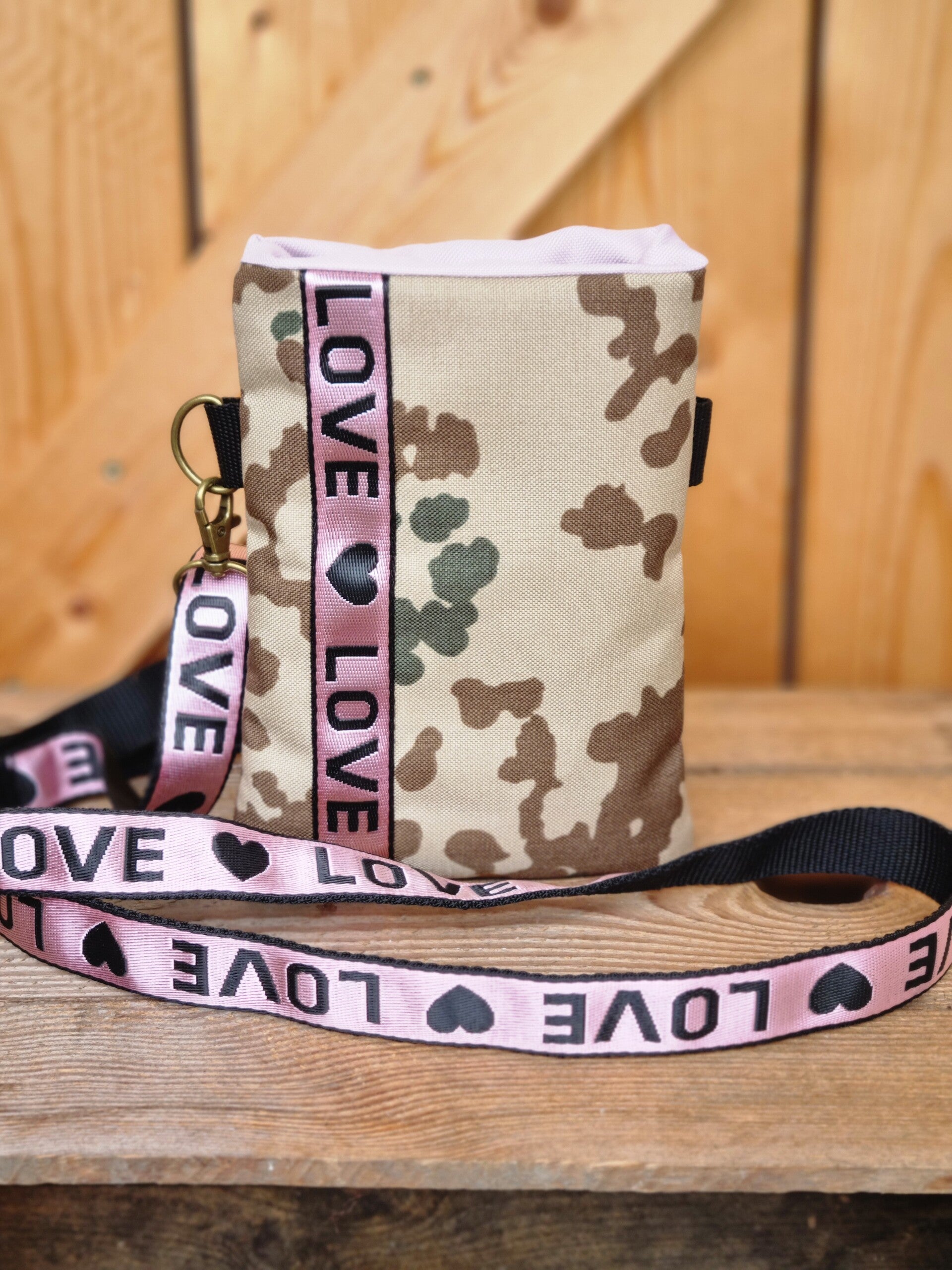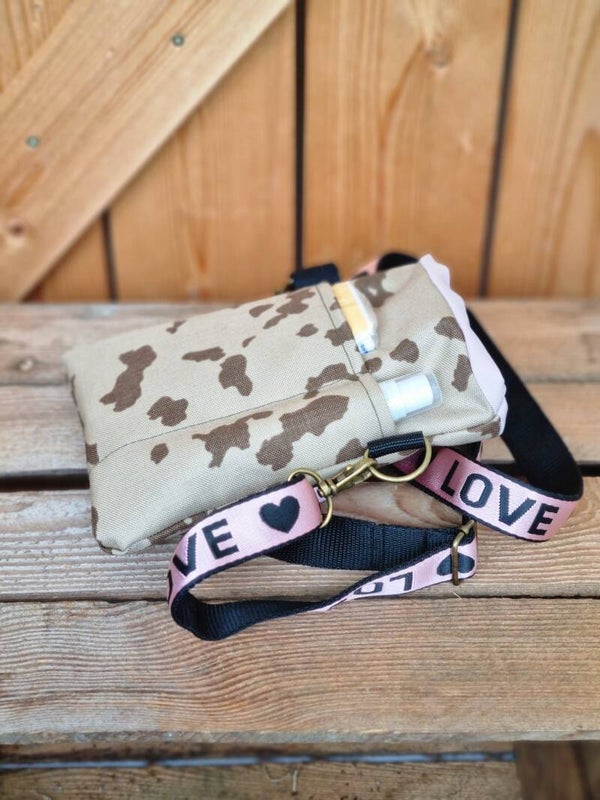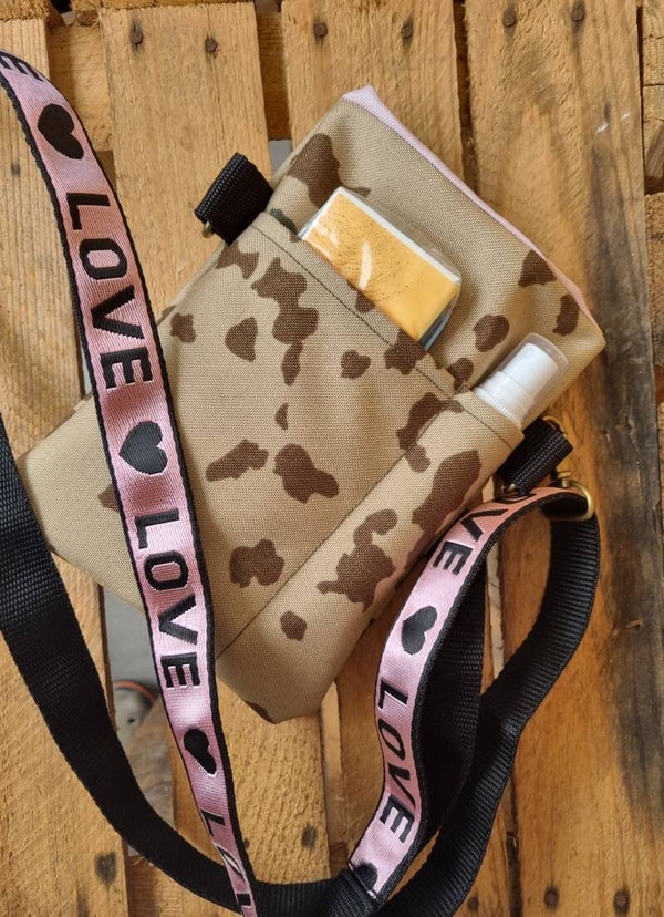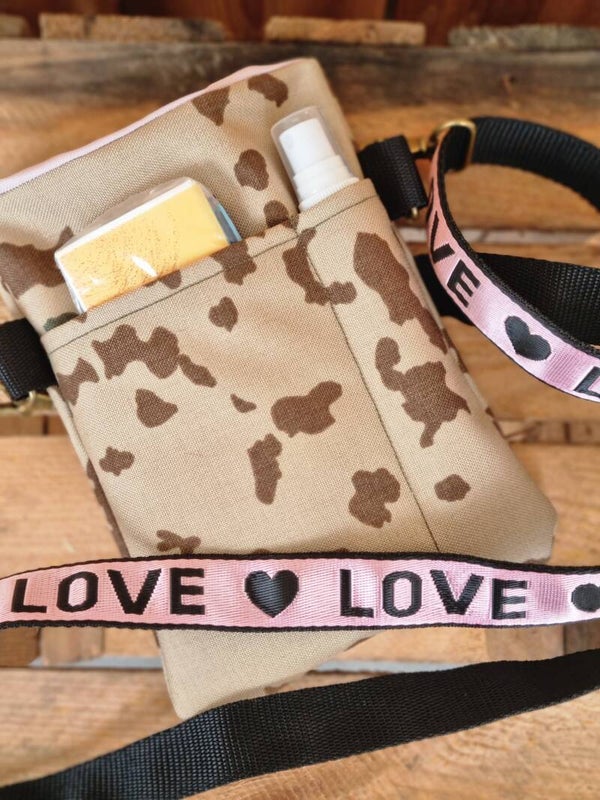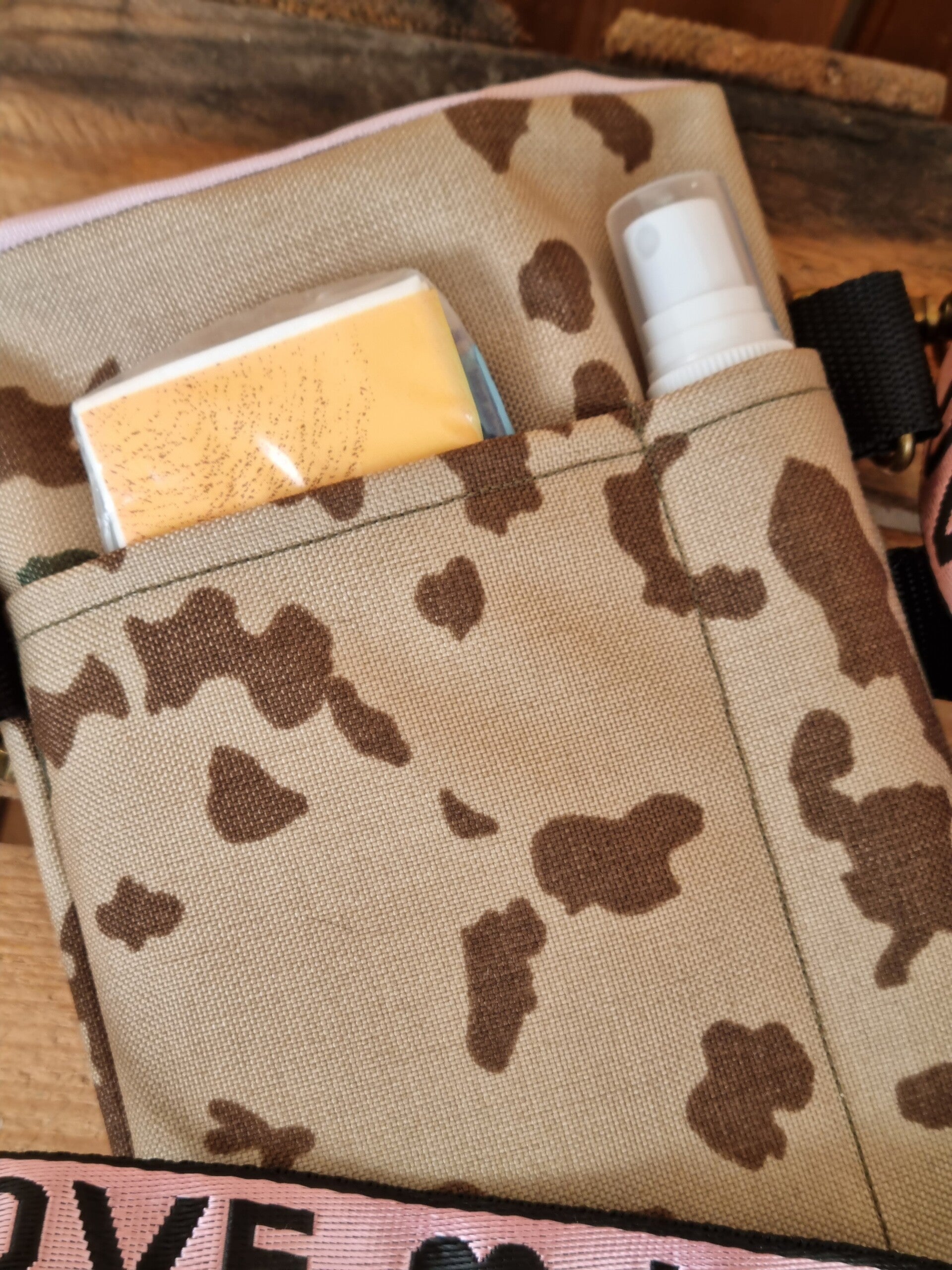 Eine Gassitasche mit großem Fach für das wichtigste also Leckerlie, dazu auf der Rückseite der Tasche zwei separate Fächer für Kleinigkeiten wie Taschentücher oder Kotbeutel und ein Desinfektionsmittel.
