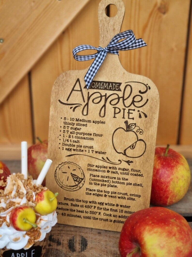 Ein Farmhaus Stil Holz Schneidebrett mit Apple Pie Rezept als Laser Gravur.