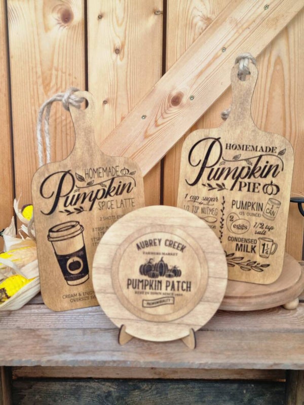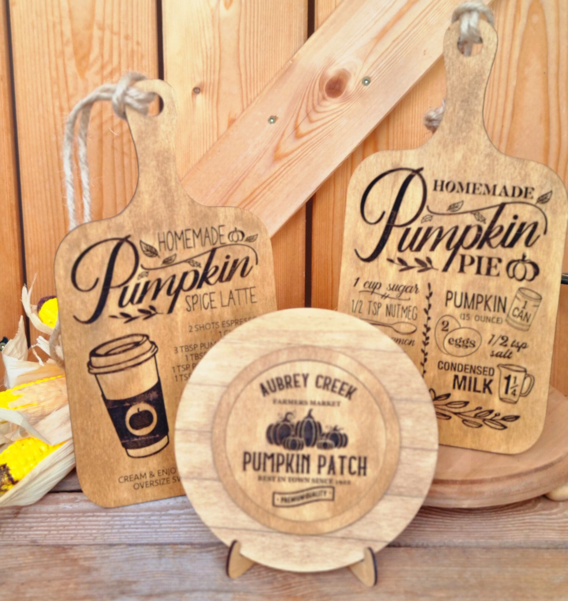 Ein Rezept für Pumpkin pie als Laser Gravur auf einem Birken Holz Brett in Nussbaum Hell Beize.