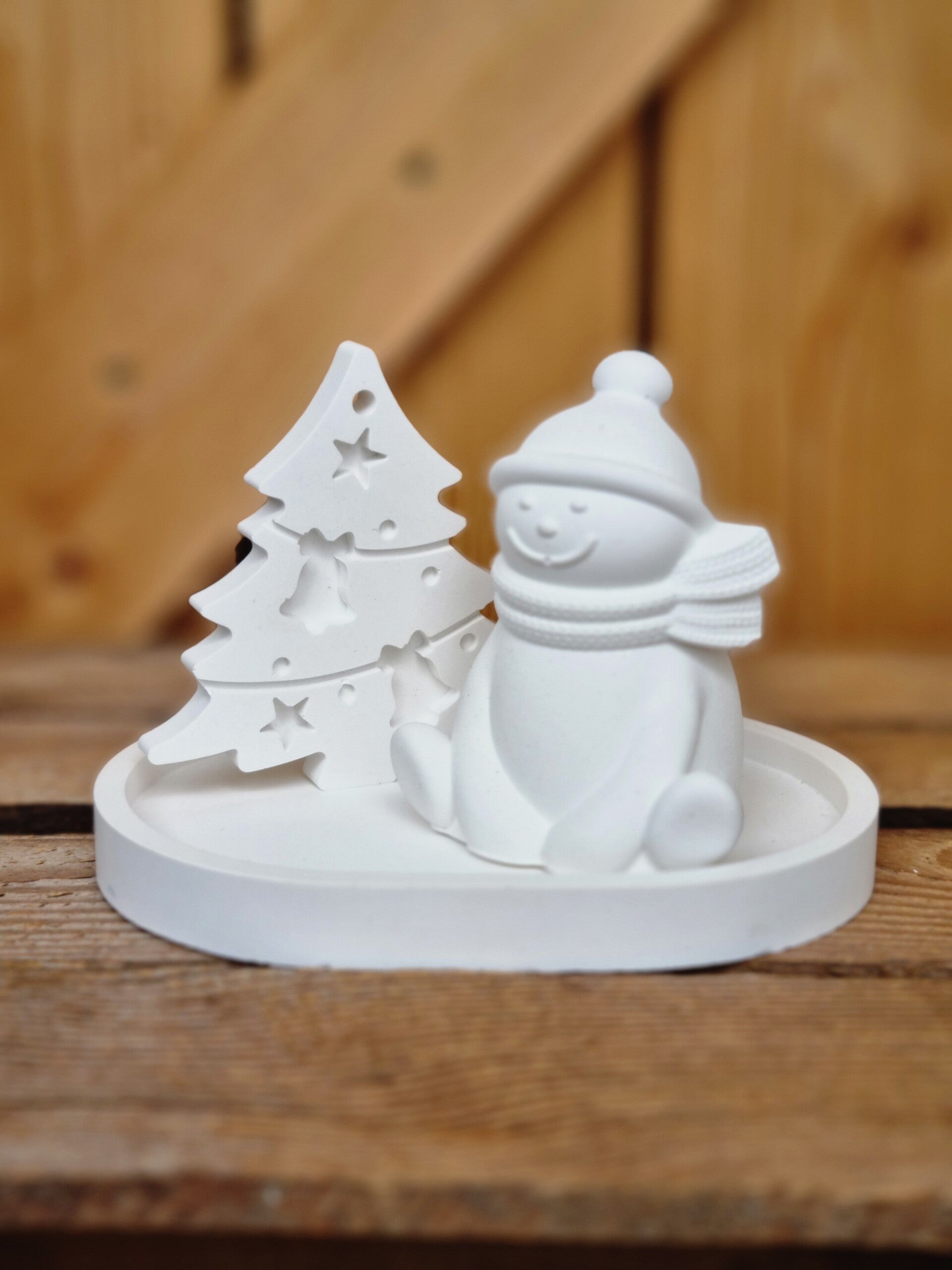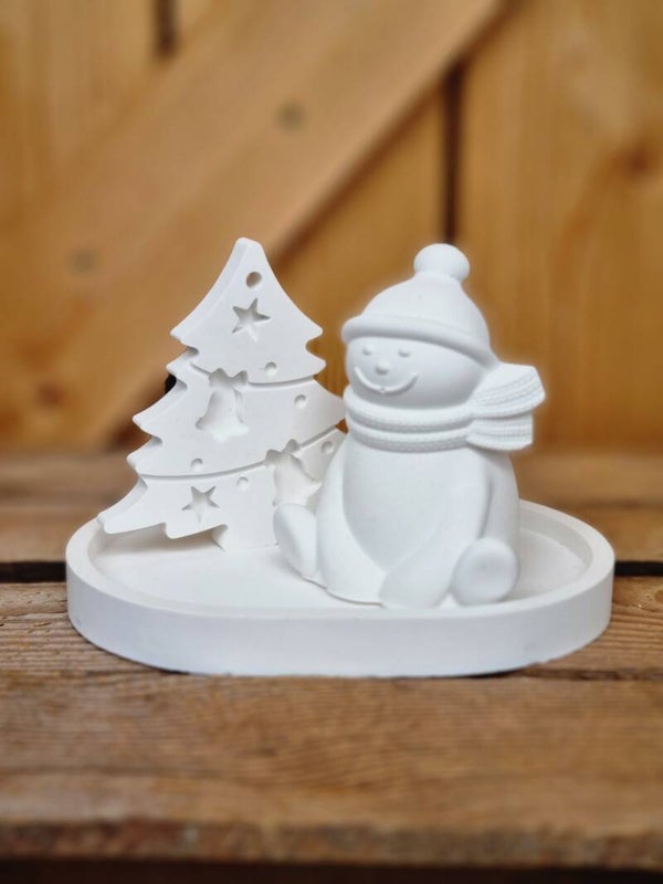 Tannenbäumchen mit Schneeman auf einem Tablet.