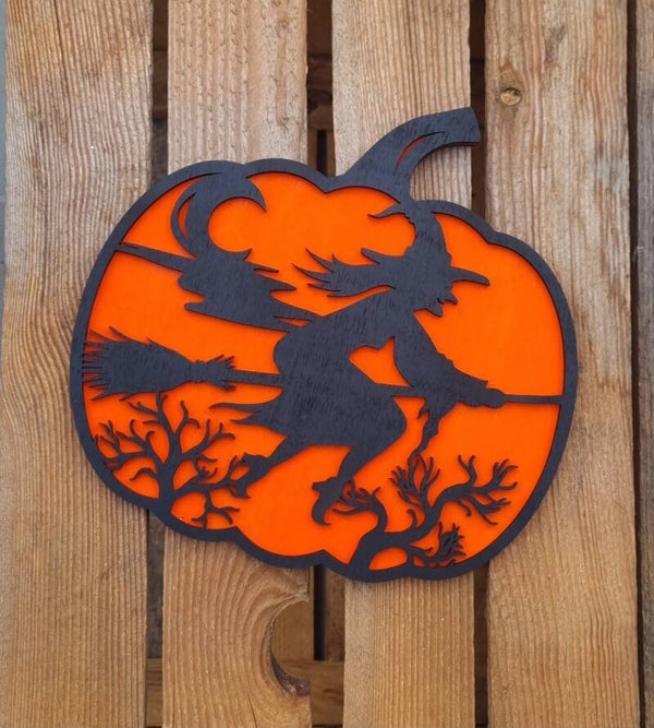 23 cm x 23 cm Kürbis mit einer Hexe auf einem Besen Motiv.
