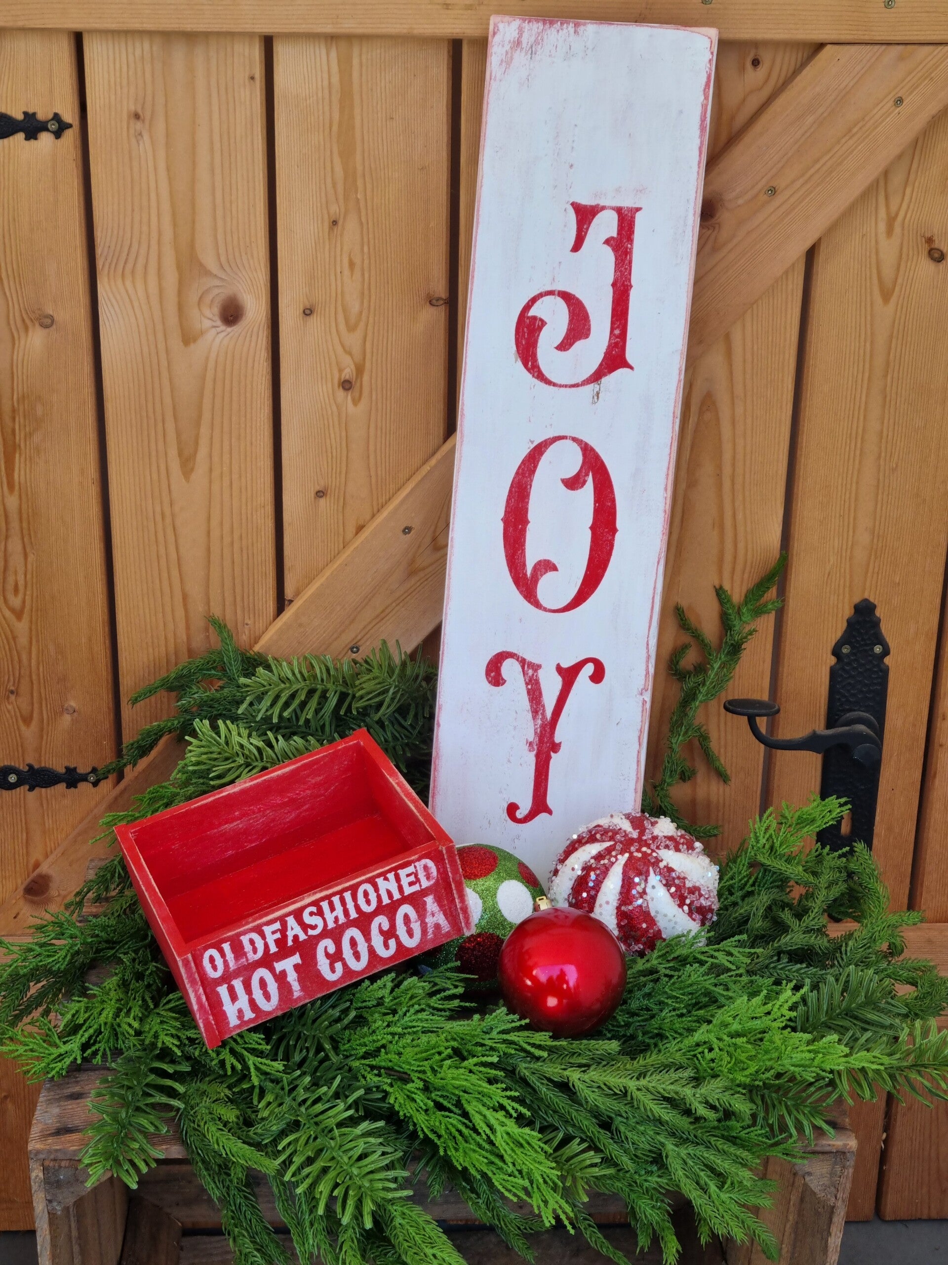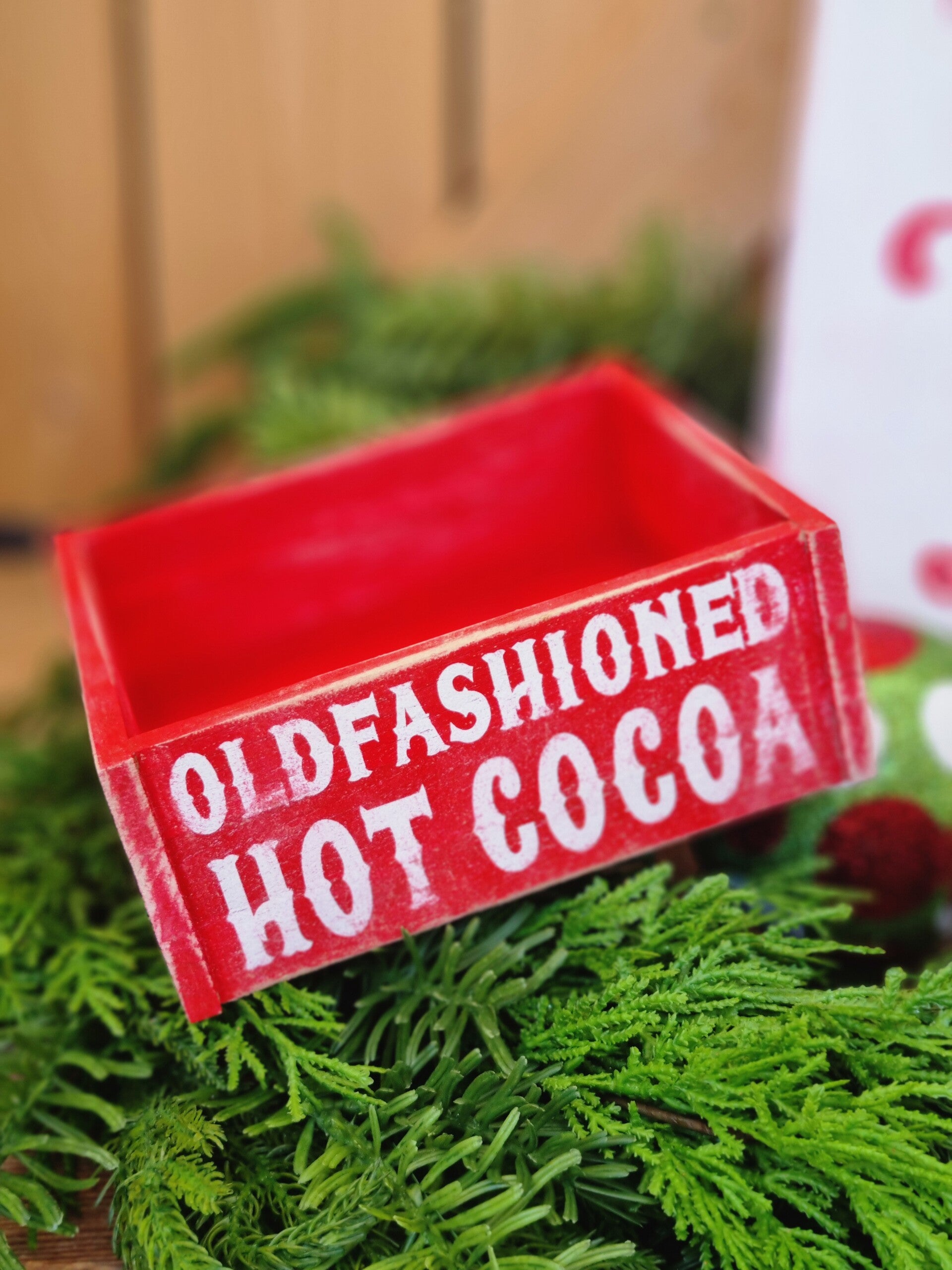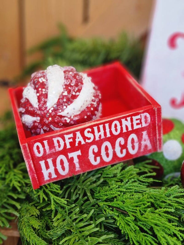 Eine Rustikale Holzkiste mit hot cocoa Thema.