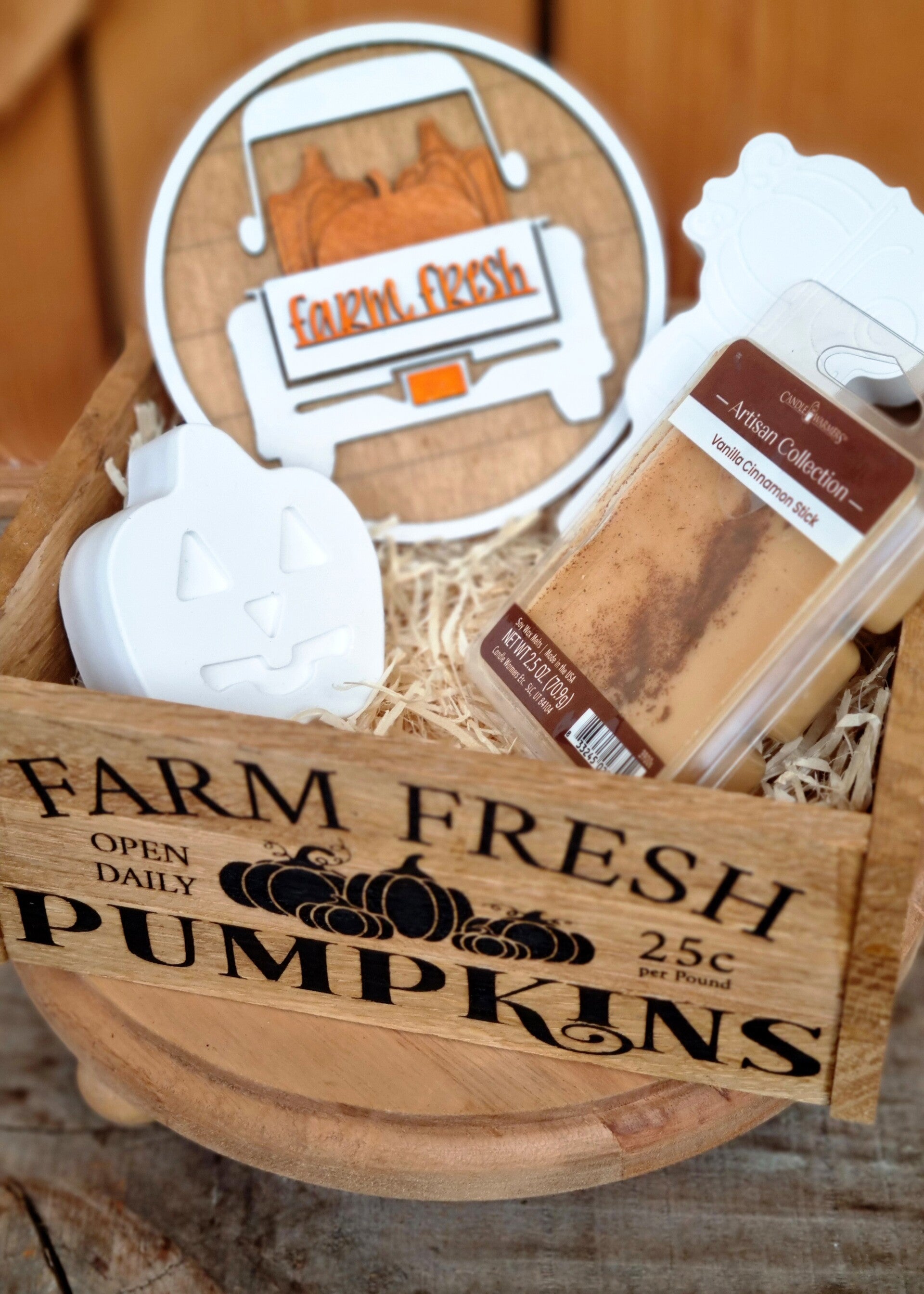 Aus Eichenholz Holz gebeizt, mit Nordic Jack o lantern und einem Nordic pumpkin Truck, sowie ein pumpkin Truck Holz Schild und aus den USA meine Lieblings Melts Marke ,hier in Cinnamon Stick Duft Richtung.