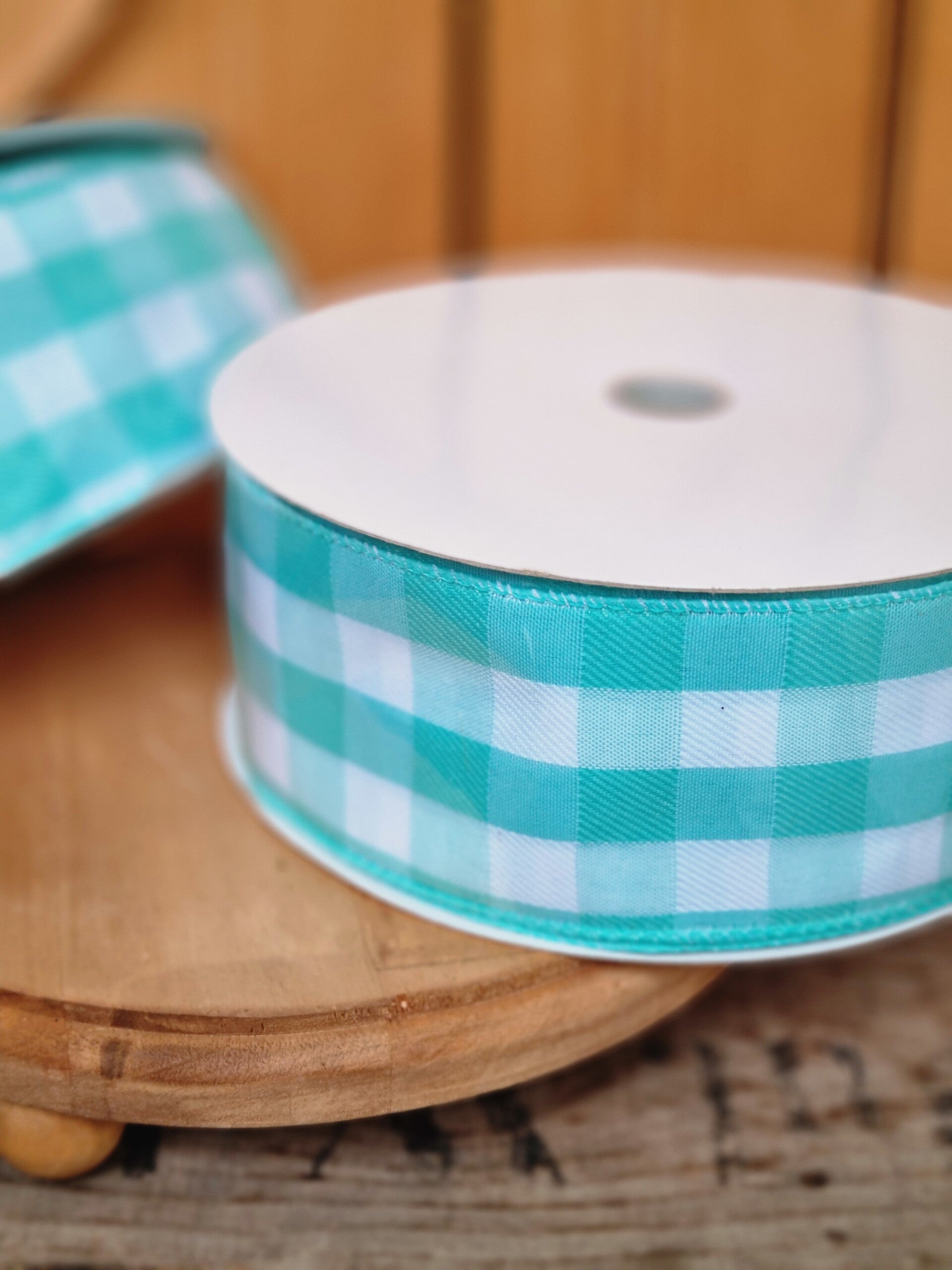 Ein Karo Schleifenband in Türkis weiß.