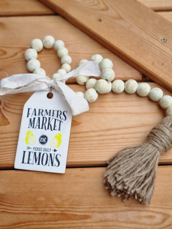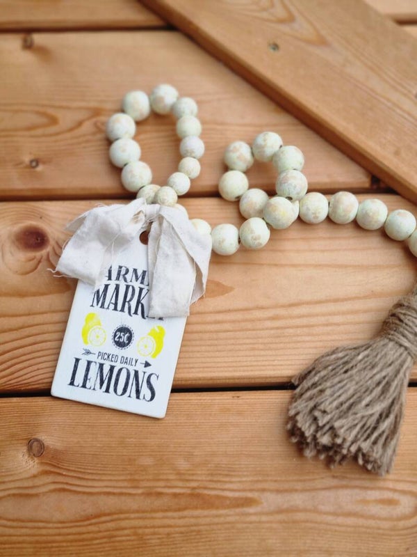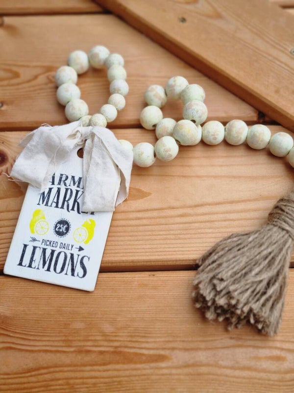 Ein Muss für Alle die Farmhouse Decor lieben.Distressed Holzperlen in weiß und pastel gelb ,ein Holz Anhänger Schildchen und Jute Natur Quaste.Ca.77 cm Länge.Perfekt für das ganze Jahr über zu dekorieren.