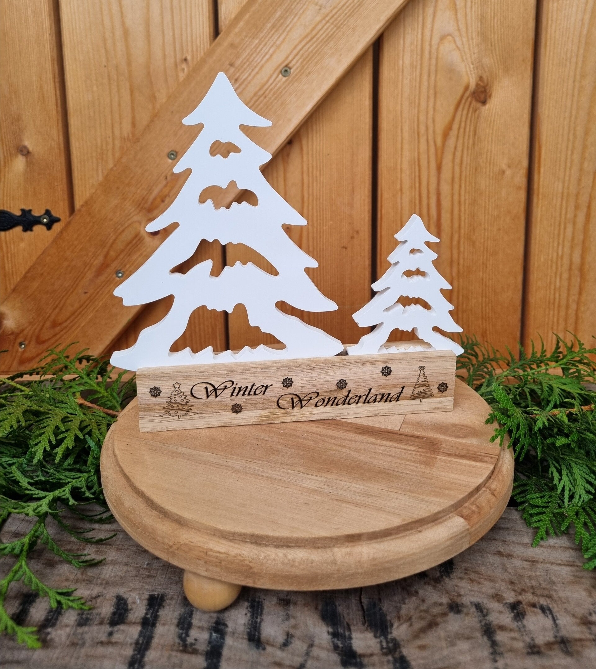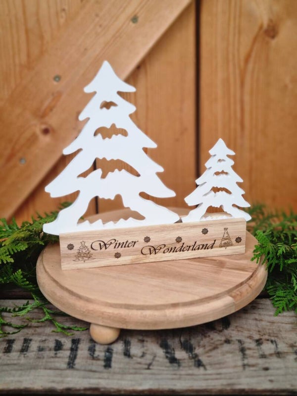 Zwei Tannen Bäume in einem Holz Gestell mit Laser Gravur Winter wonderland, perfekt als Winter und Weihnachtsdeko, als Geschenk, Mitbringsel, dezent und Stimmungsvoll zugleich.
