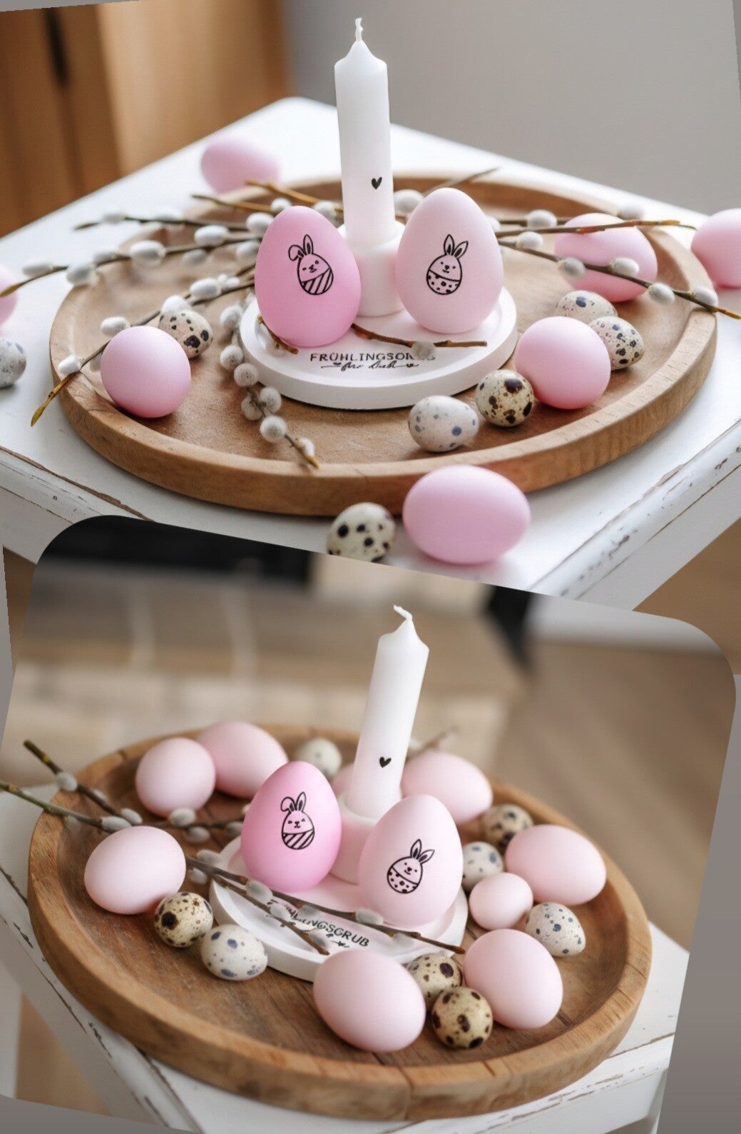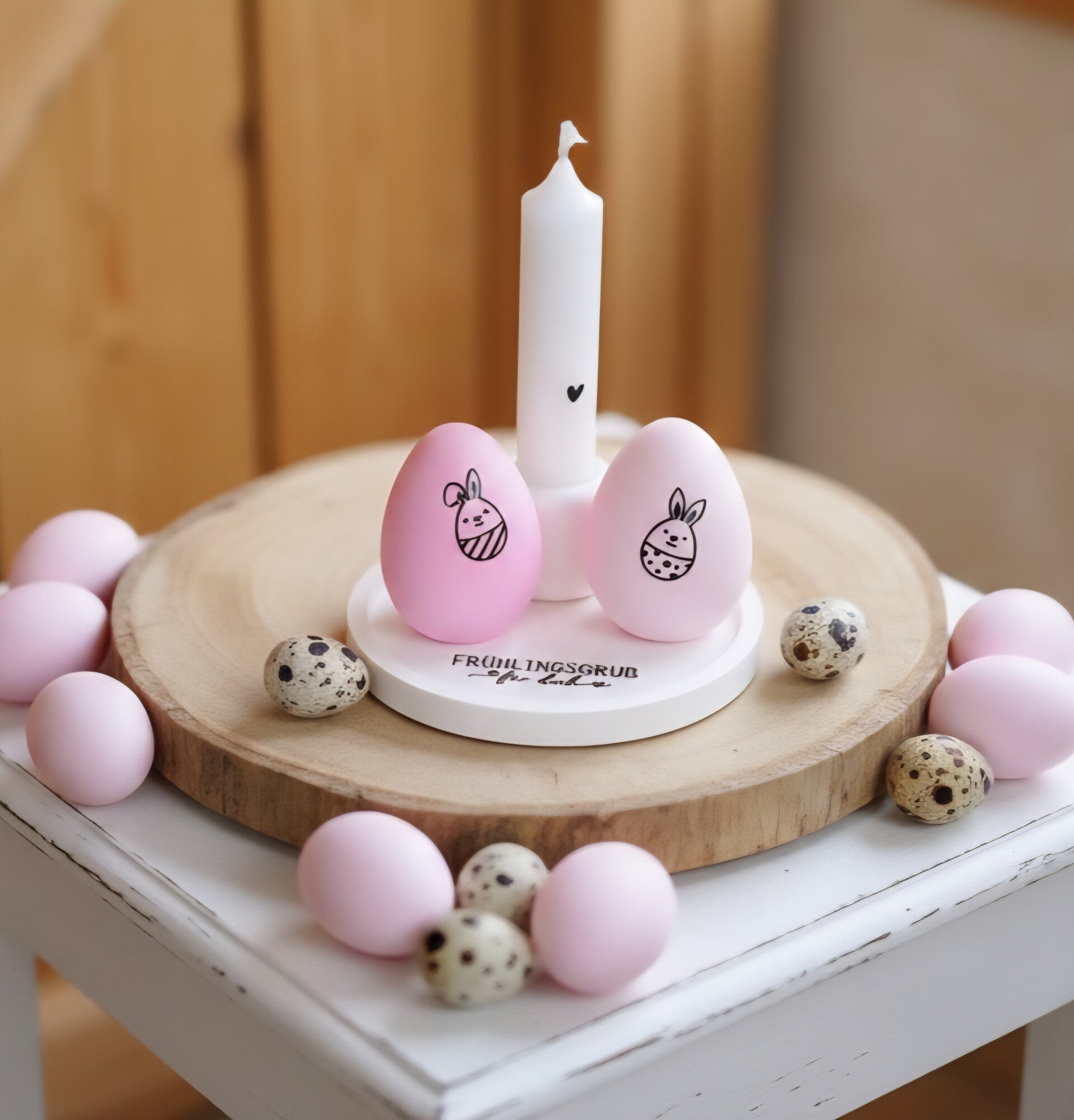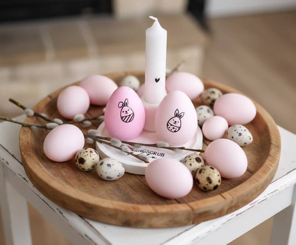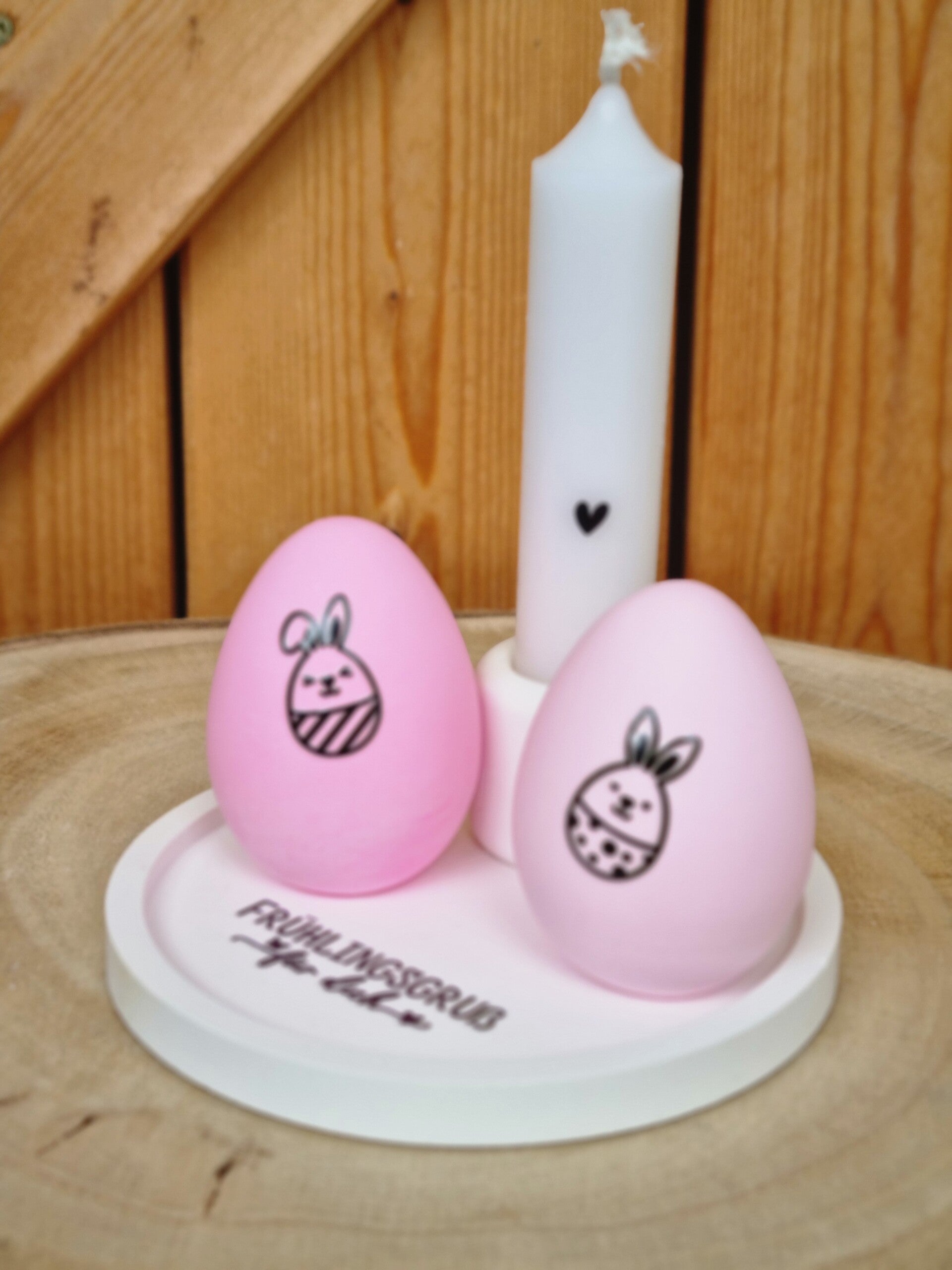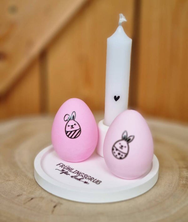 Ein süßer Oster Set ,Tablet mit Oster Gruß, zwe pastel rosa Ostereiern und eine Kerze in Kerzen Halter.