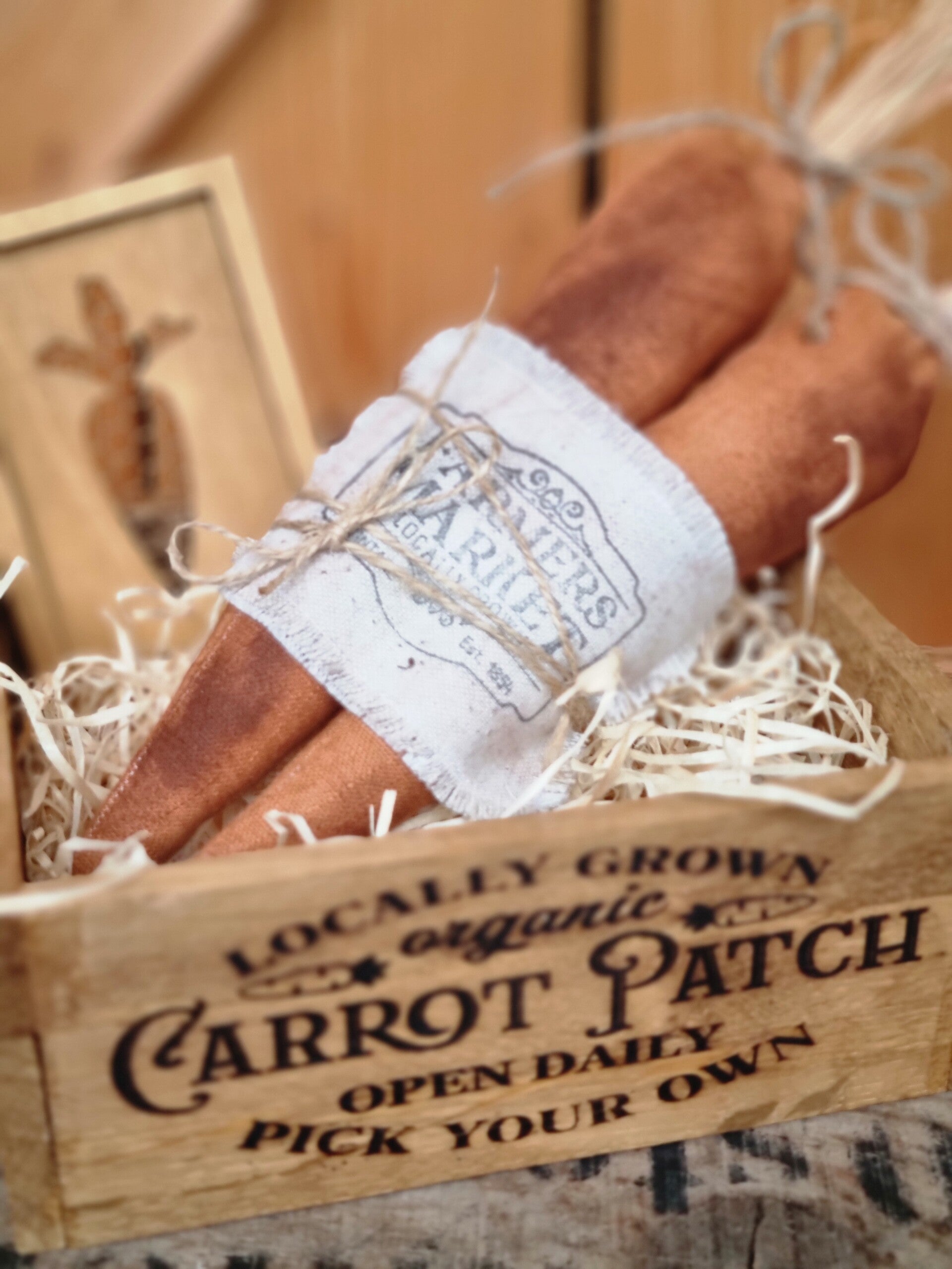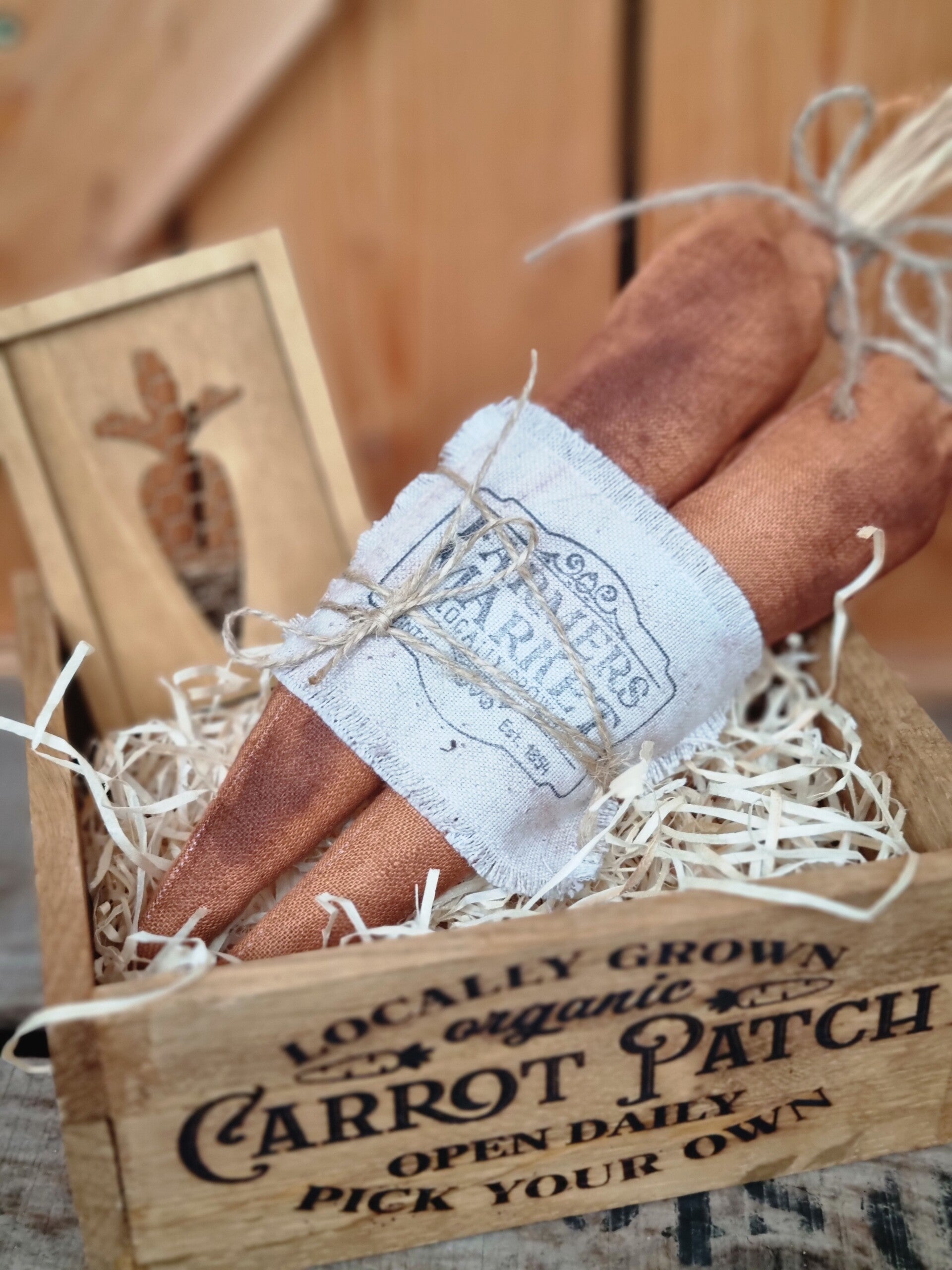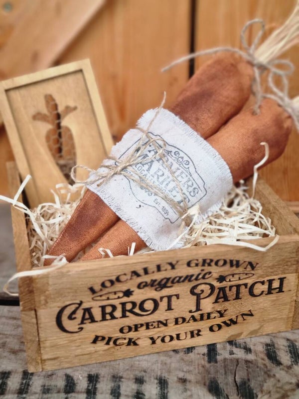 Dieser cooler Set besteht aus einer rustikalen Holzkiste, Zwei Großen Karotten in Vintage Look und einem Holz Schild in chicken wire look .