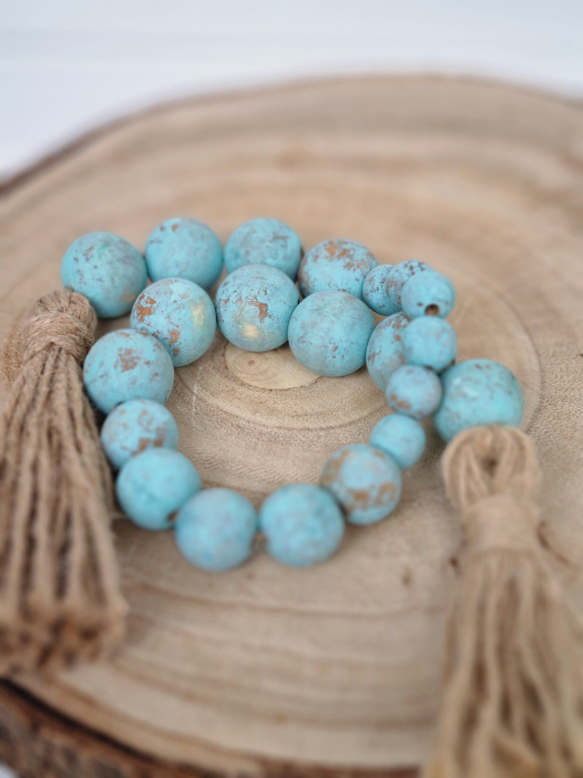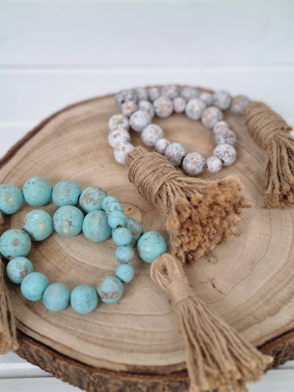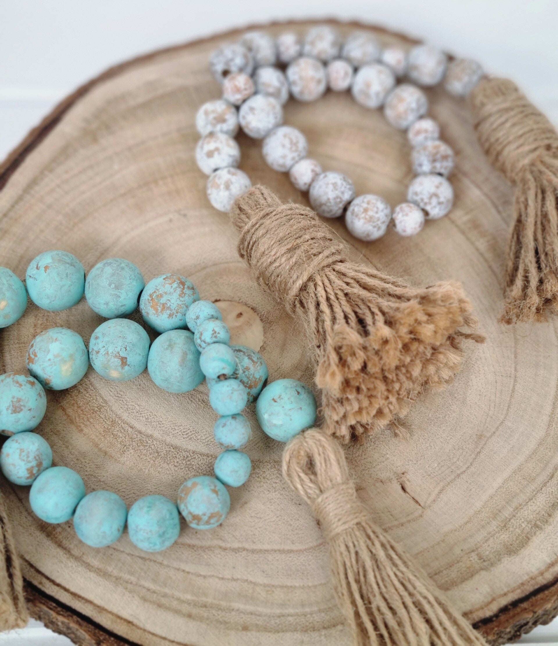 Zur Auswahl eine Holzperlen Girlande distressed weiß und distressed türkis.