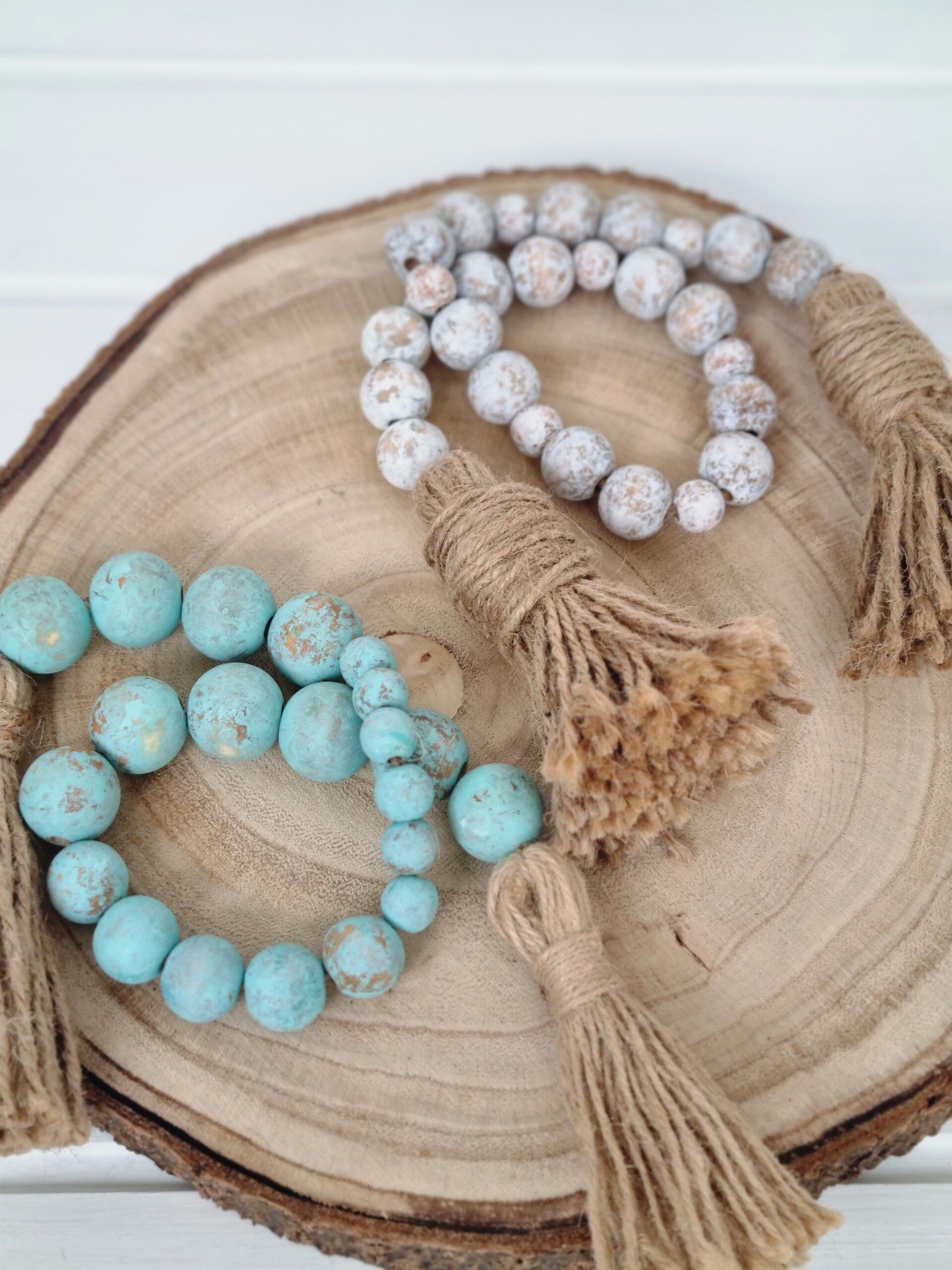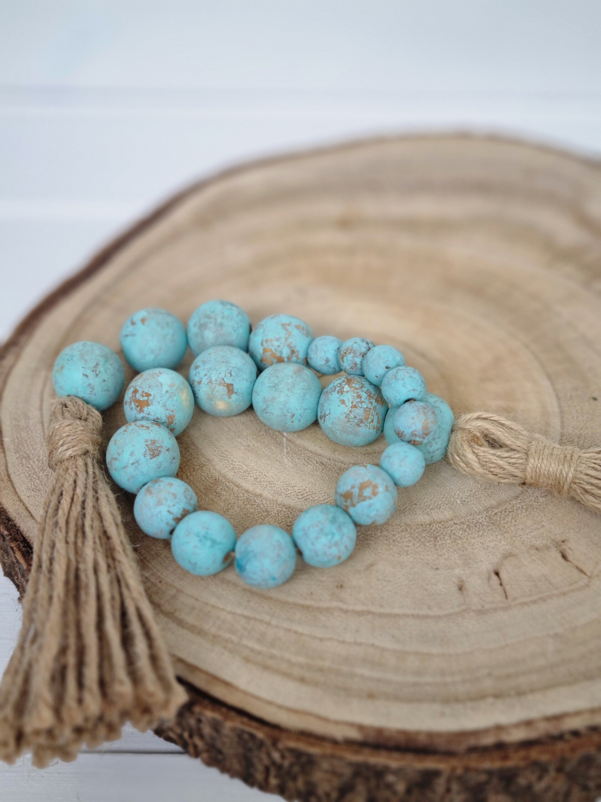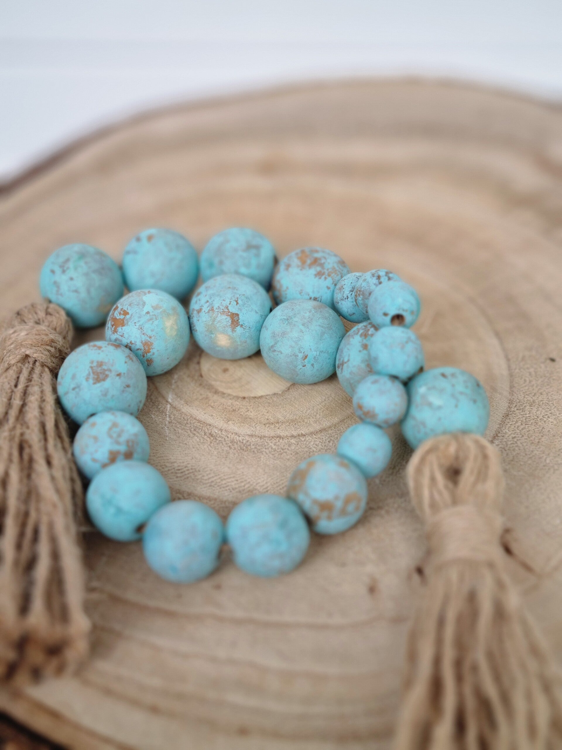 Zur Auswahl eine Holzperlen Girlande distressed weiß und distressed türkis.