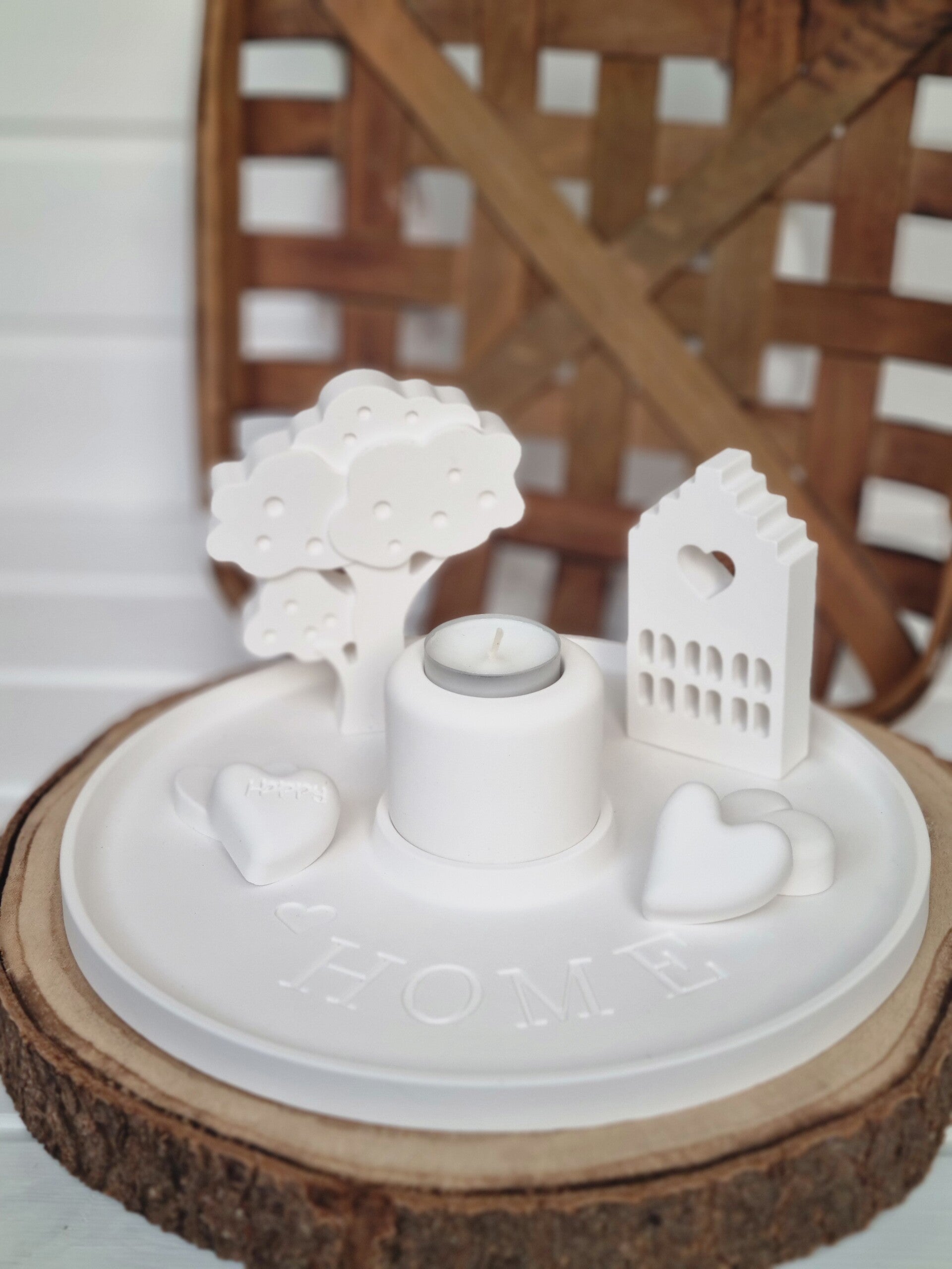 Ein wunderschönes großes Tablet in 25 cm Durchmesser.In der Mitte ein Herzen Halter für Teelicht, vier Herzen, ein Häuschen und ein Baum.Ein Bezauberndes Dekoelement au h perfekt als Geschenk đ geeignet.
