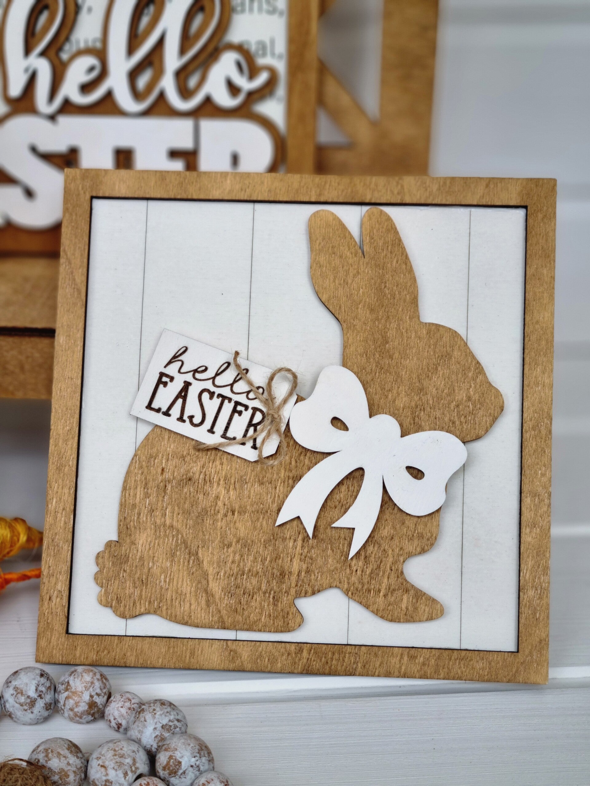 Ein Hasen Schild, Häschen mit Schleife und einem Happy Easter tag.