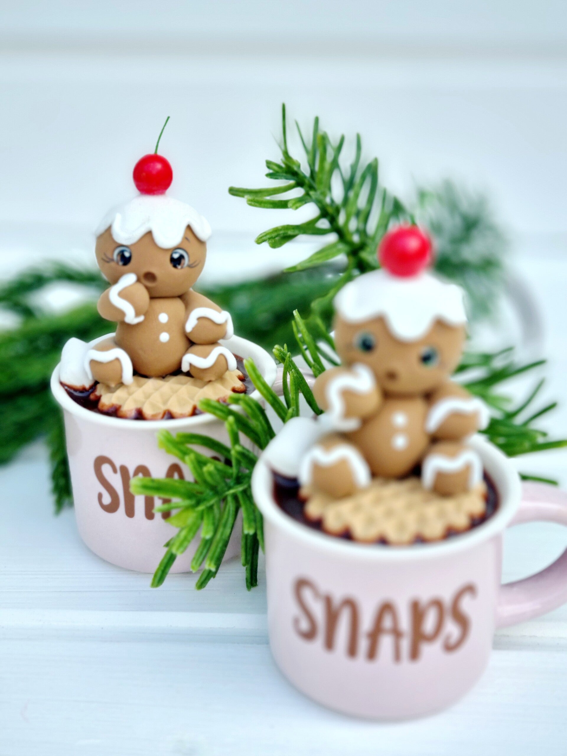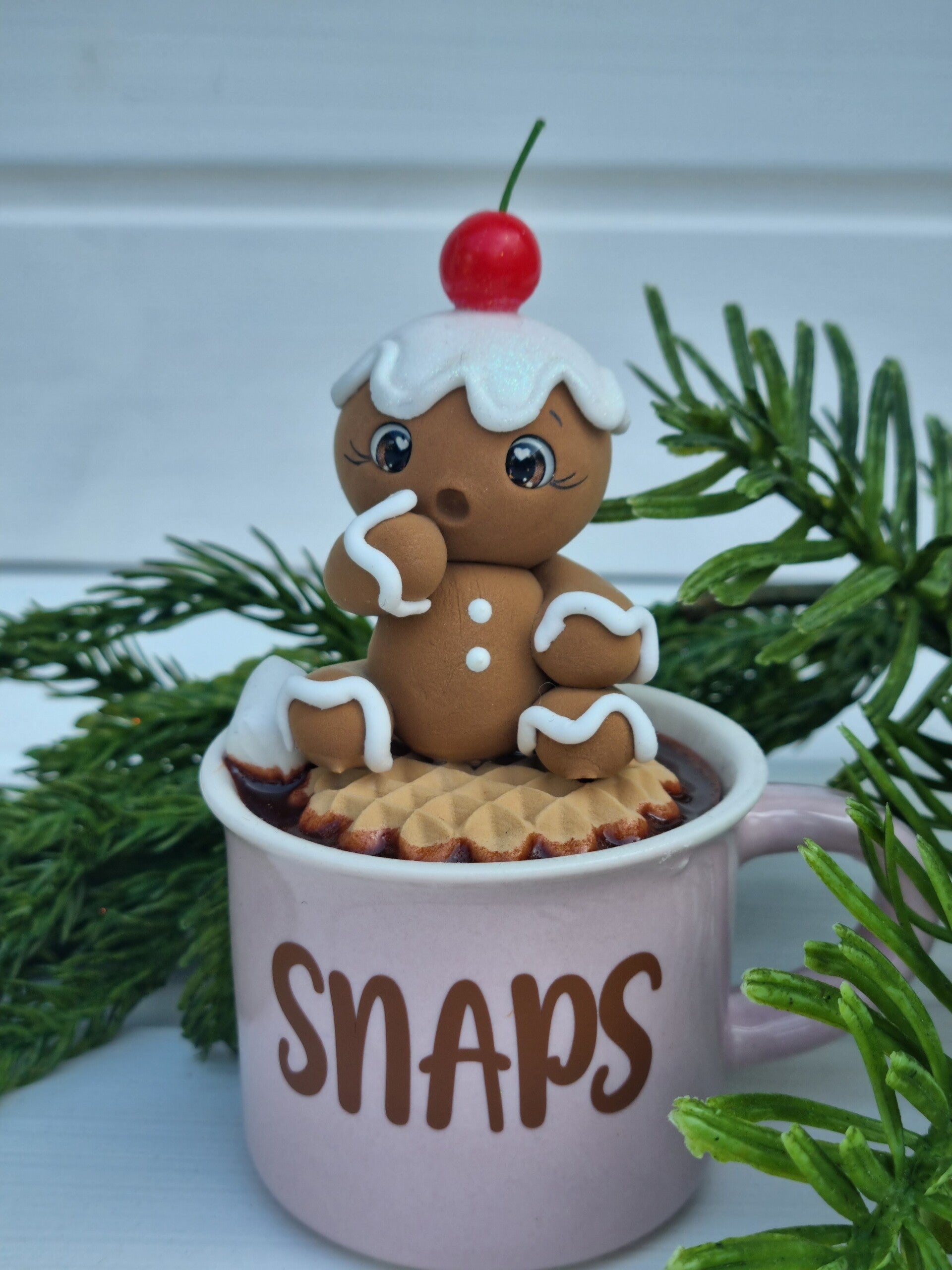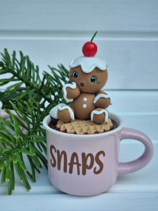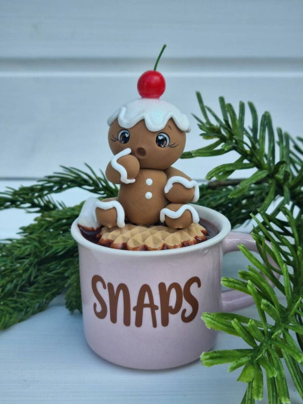 Eine 150 ml Keramik Tasse mit extra süßen Lebkuchen Männchen mit Sahne Kirsche on top ☺️das in Schokolade badet.