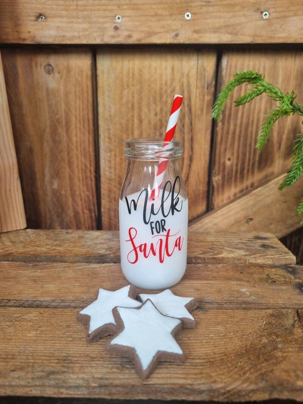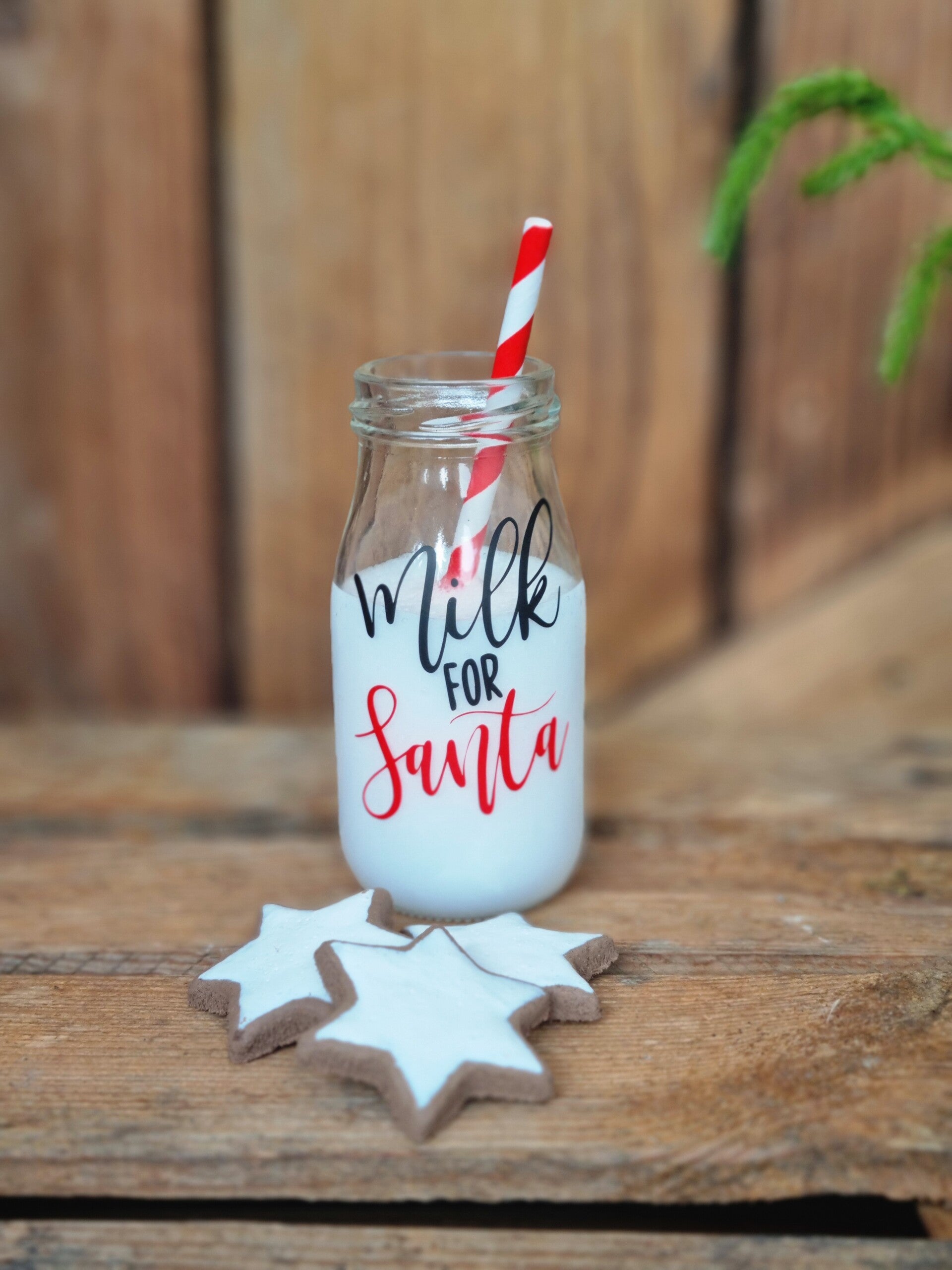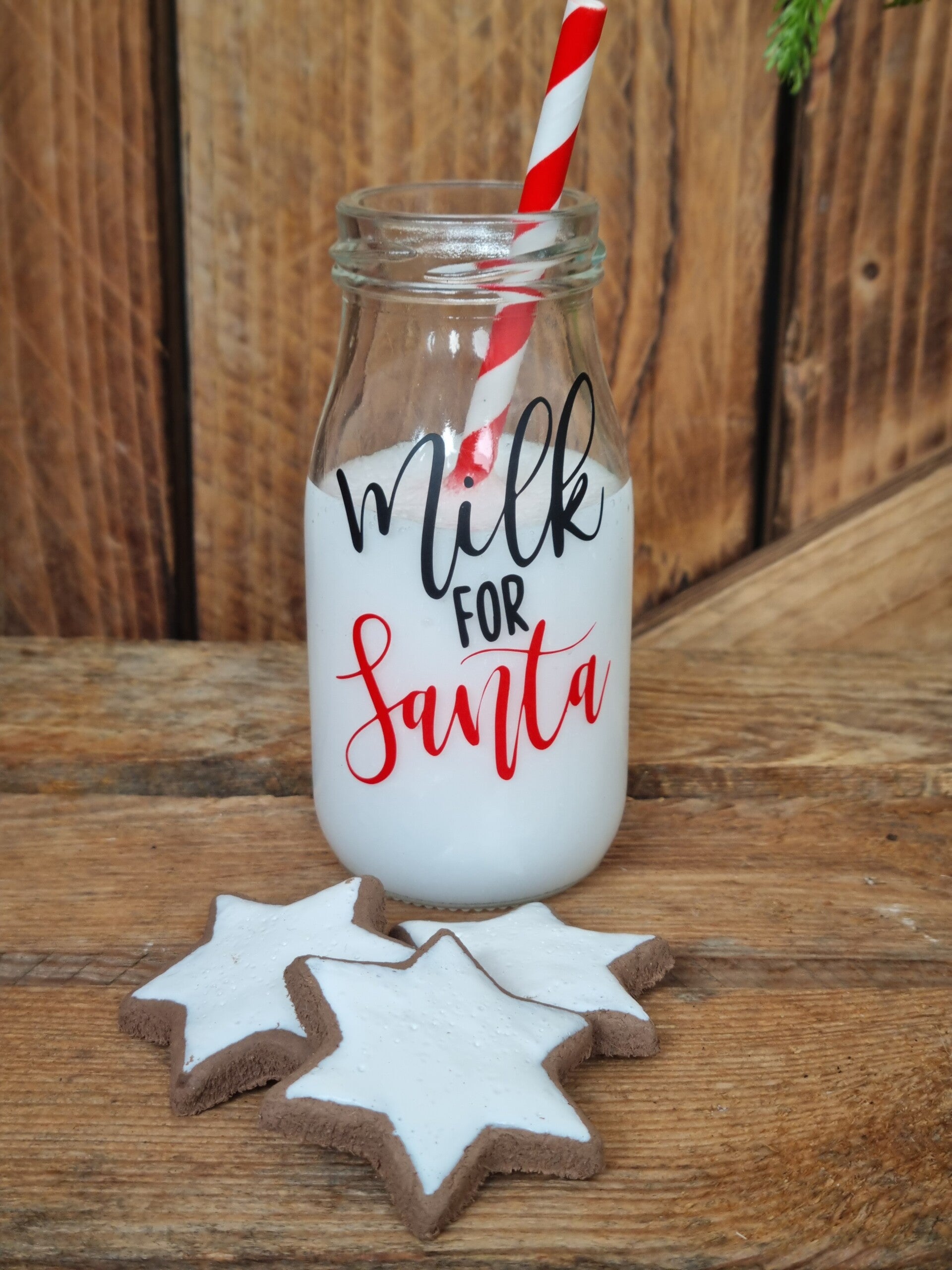 Eine 200 ml Flasche mit Milch für Santa und drei leckere Zimtstern Kekse.