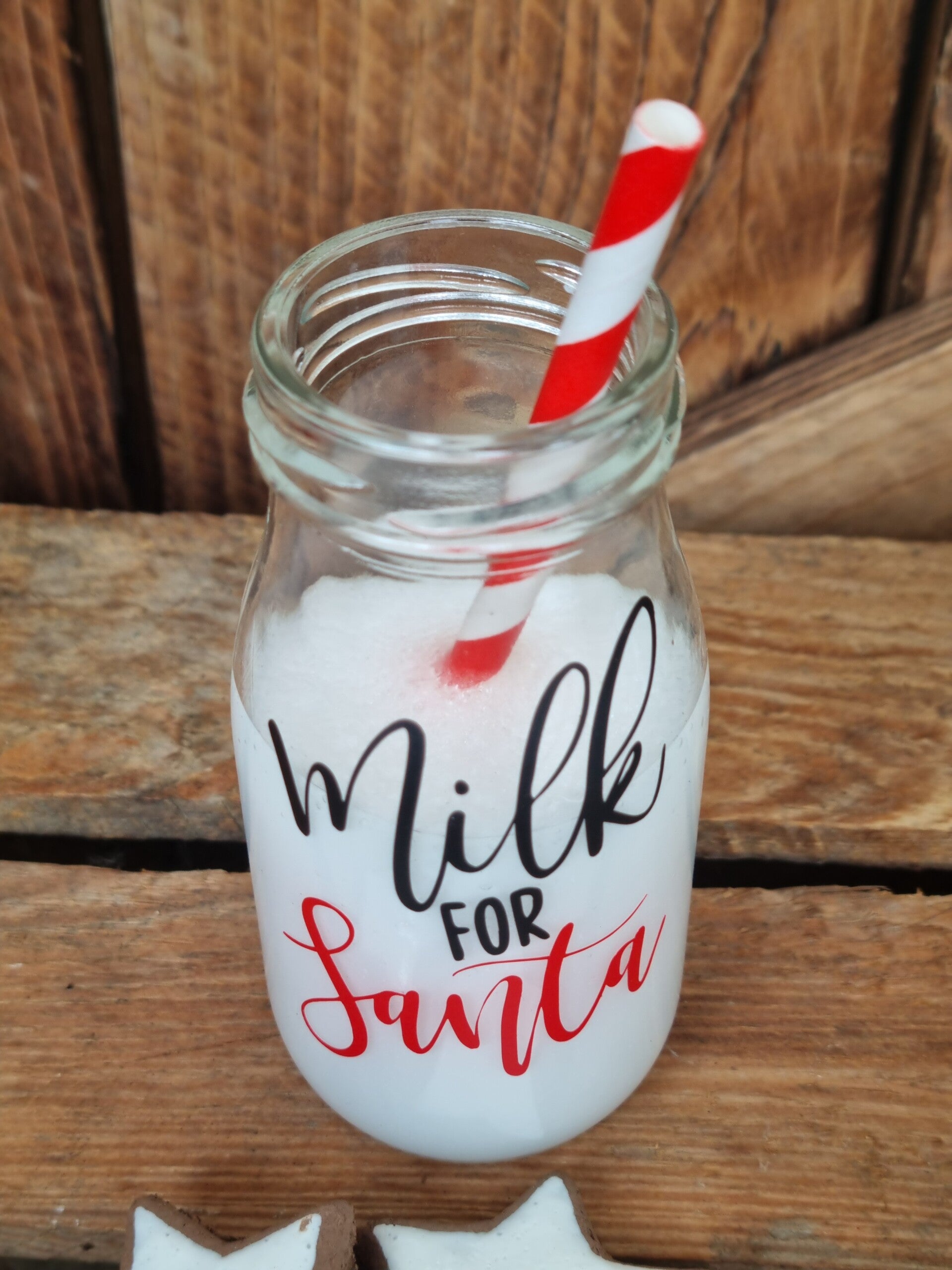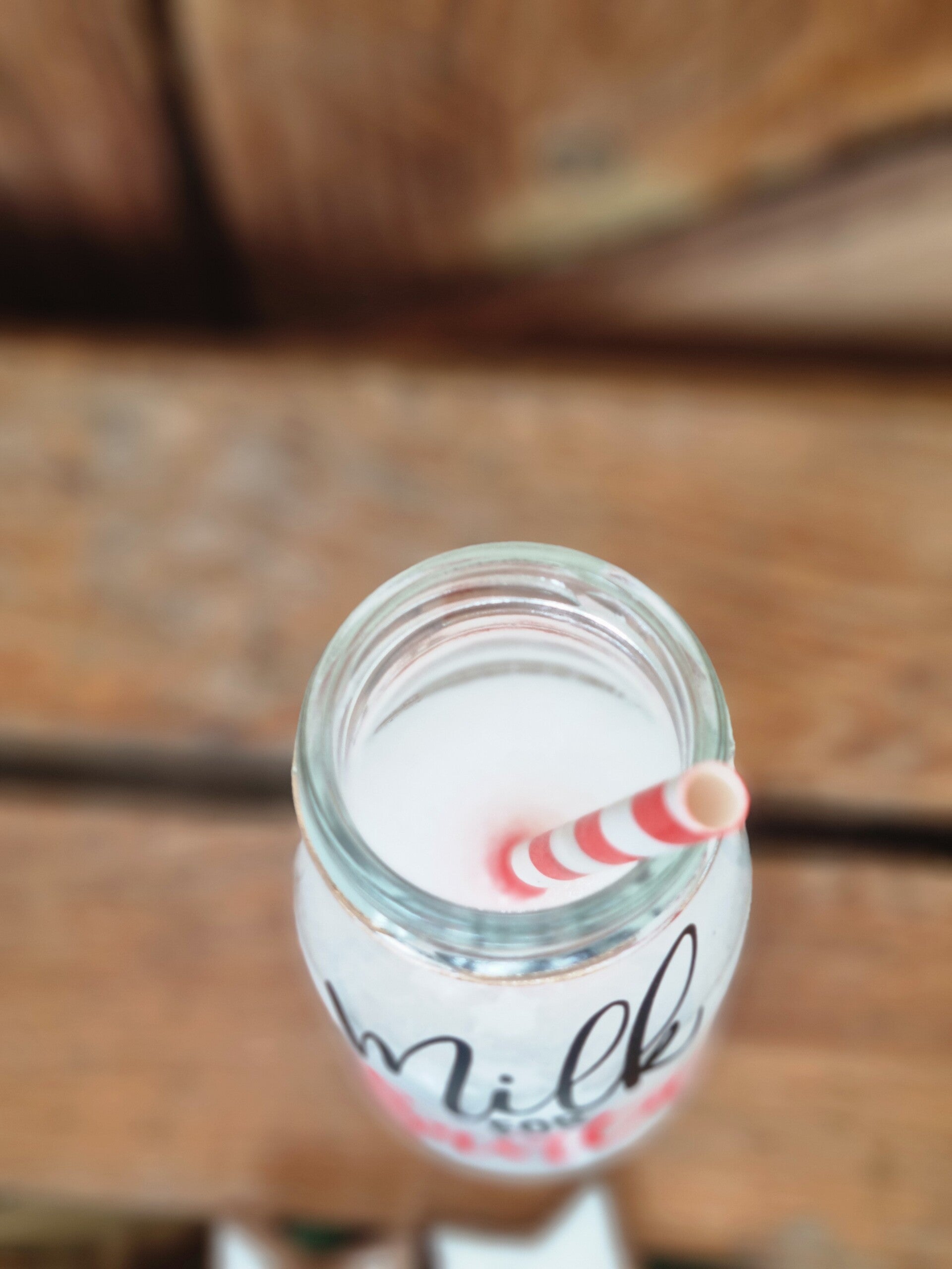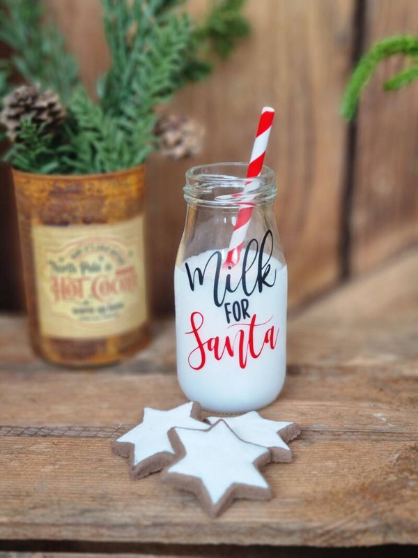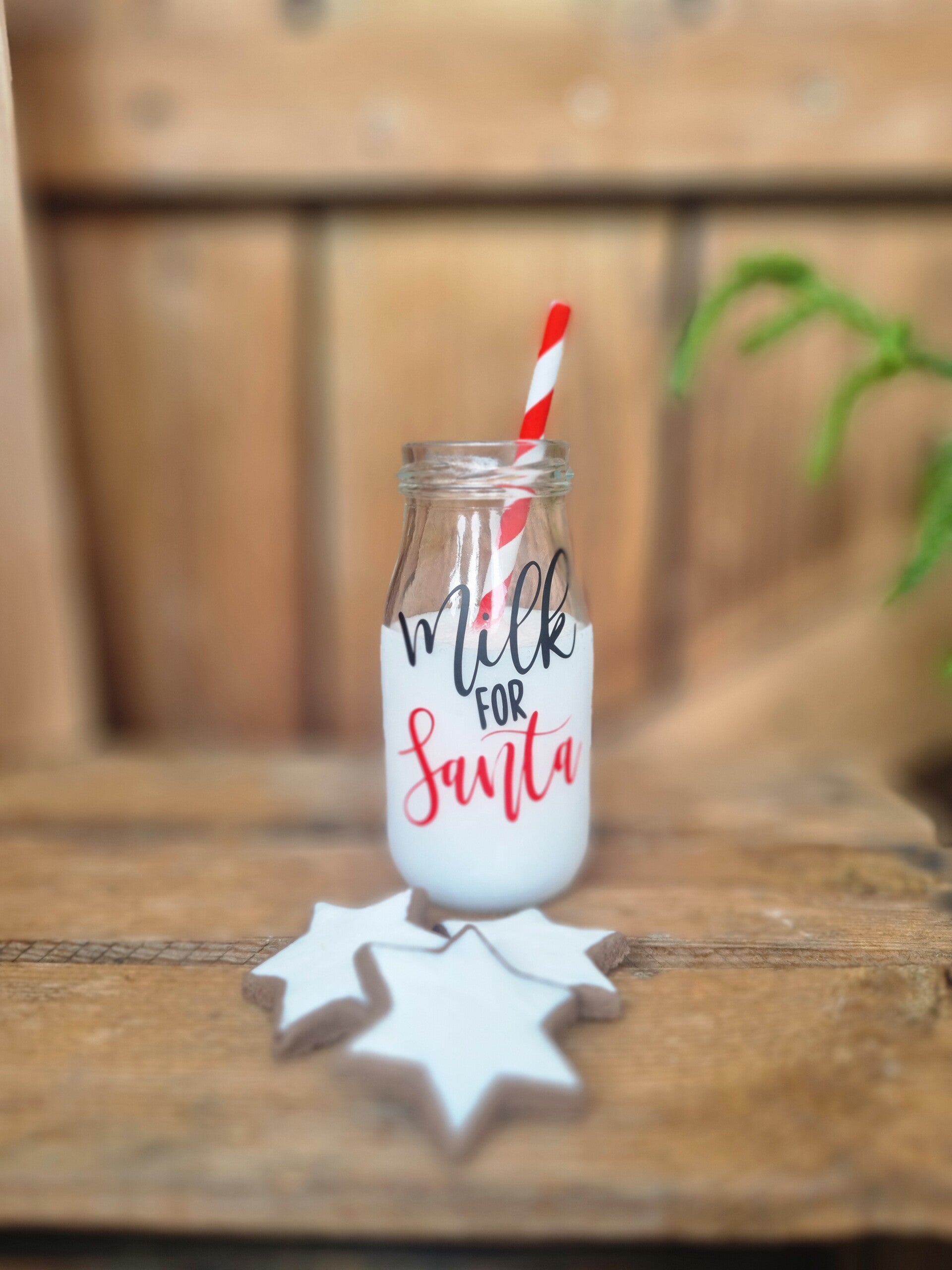 Eine 200 ml Flasche mit Milch für Santa und drei leckere Zimtstern Kekse.