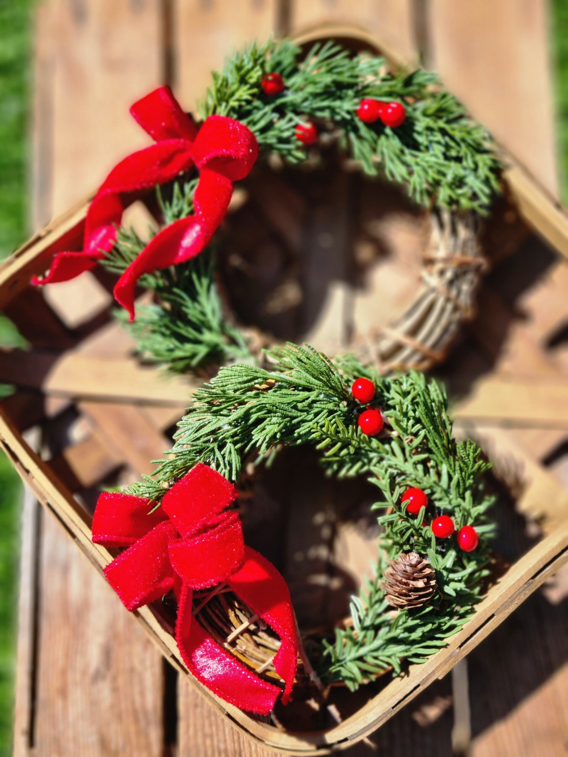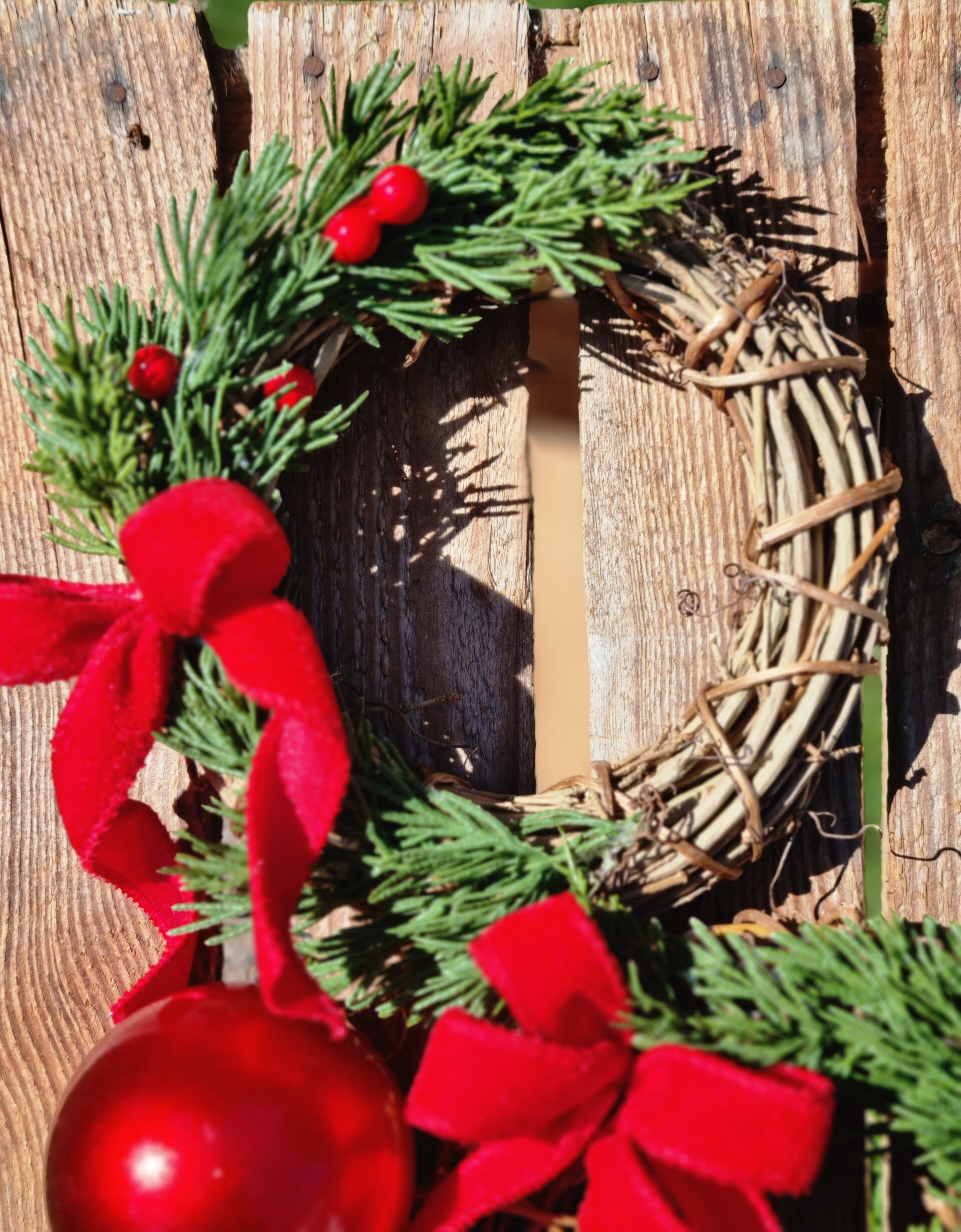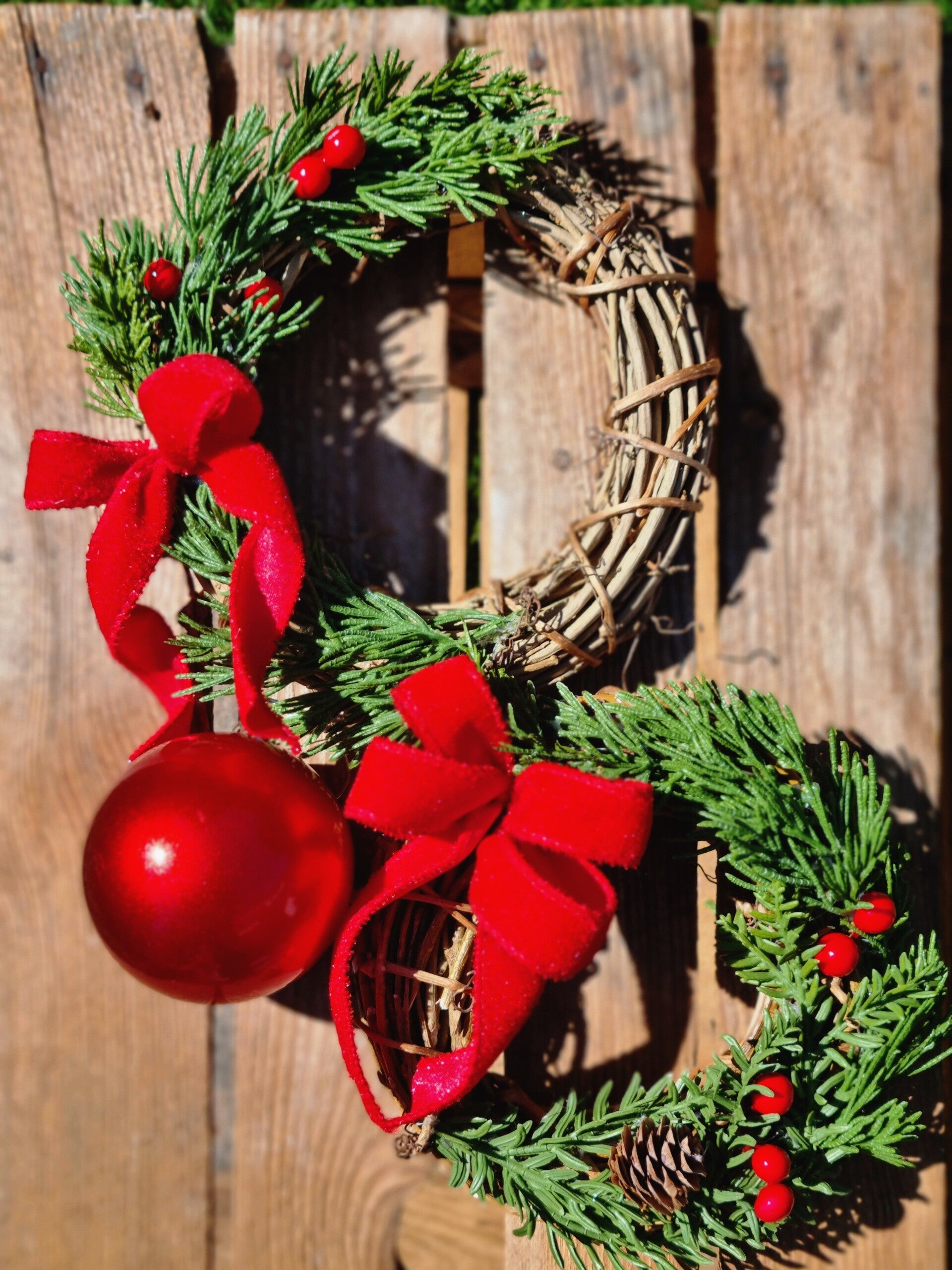 Dazu eine Weihnachts rote velvet Schleife ebenfalls aus den USA und ein paar rote Winter Beeren.