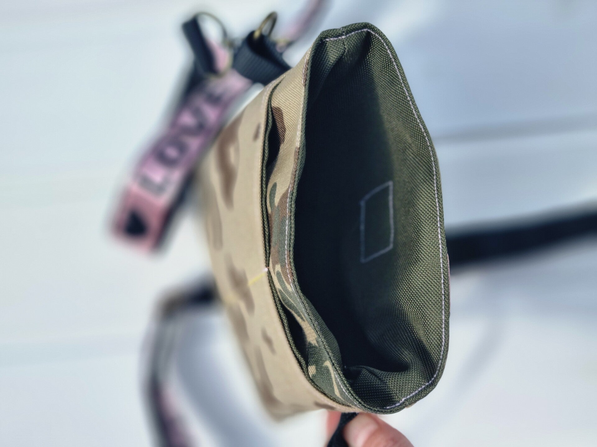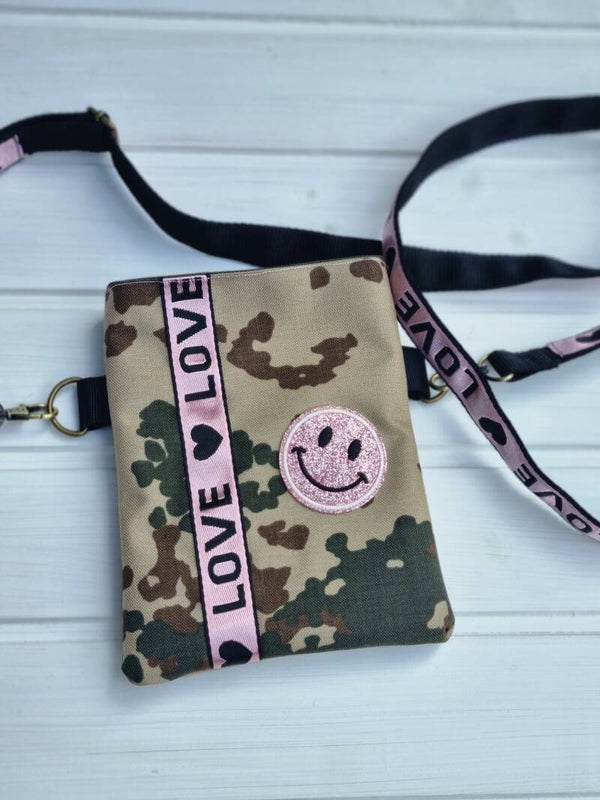 Ein Hunde Leckerbeutel aus Wasserabweisenden Wüsten Camouflage Stoff, mit rosa Applikationen.