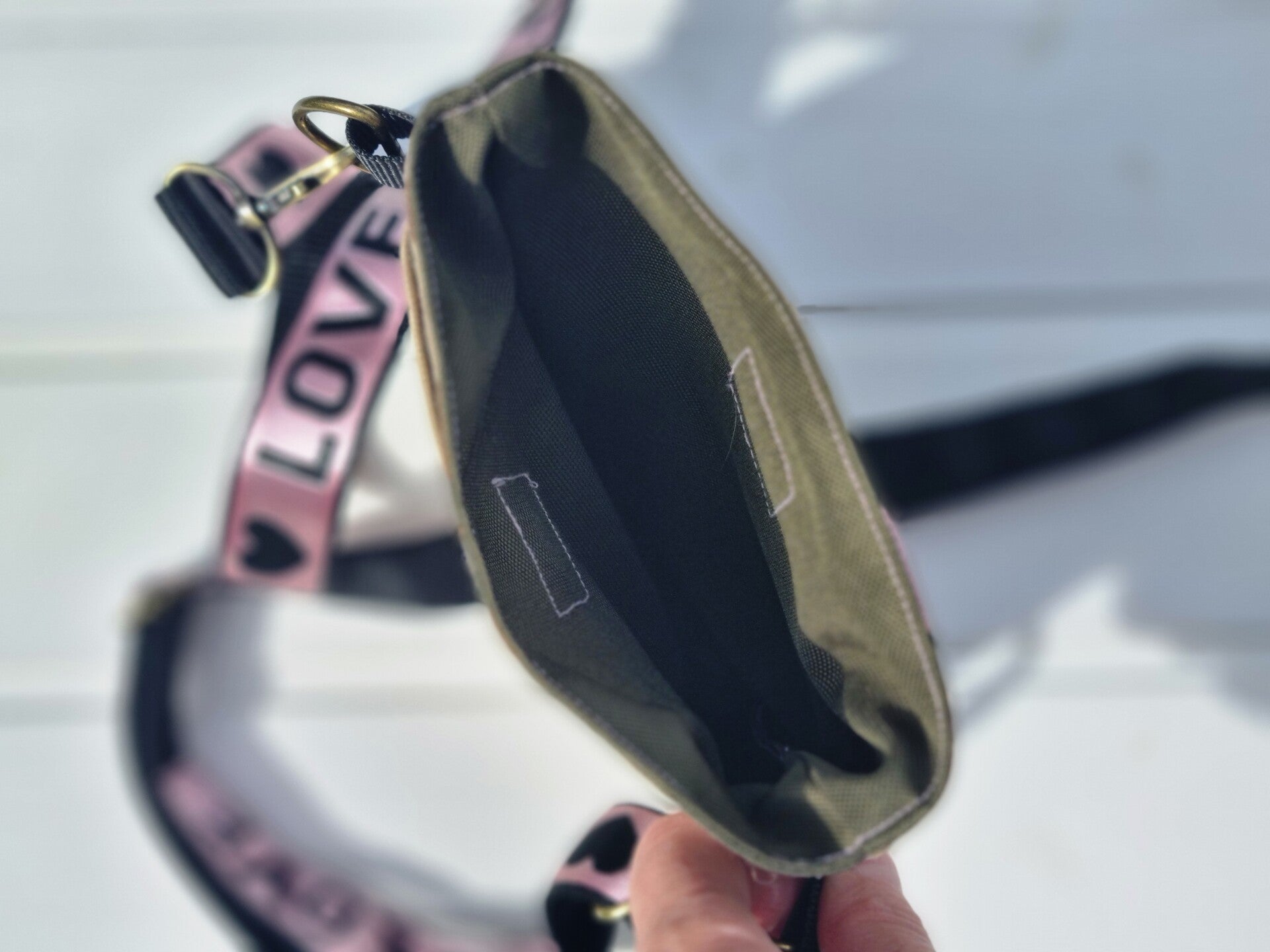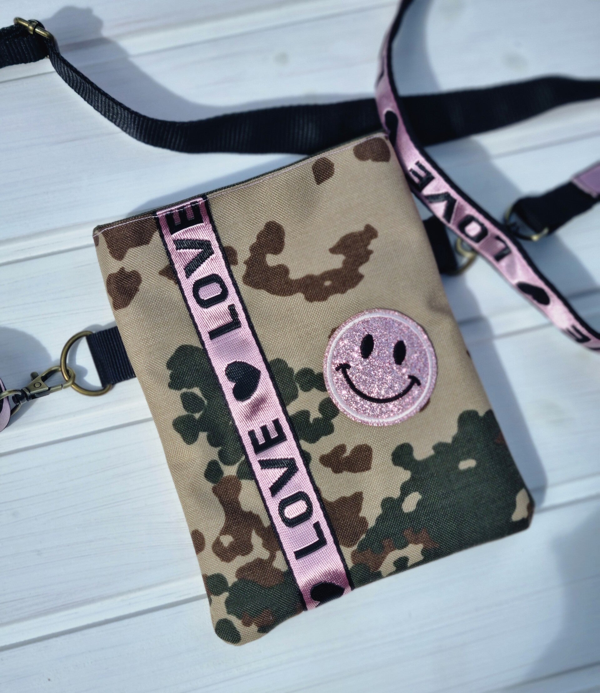 Verstellbarer Schulter Gurt mit einem love logo macht das Täschchen besonders .