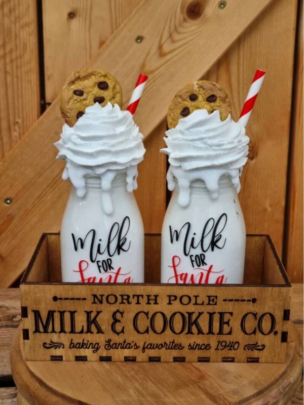 Zwei Milchflaschen mit Sahne Topper und Cookies für Santa Claus.