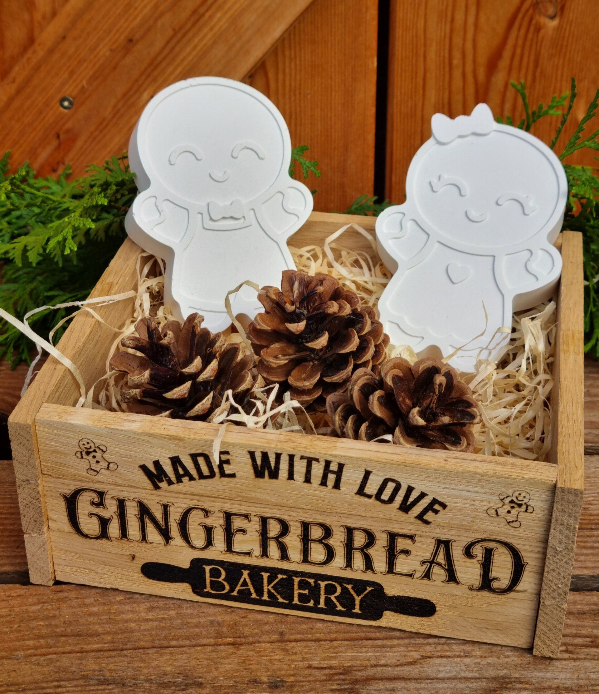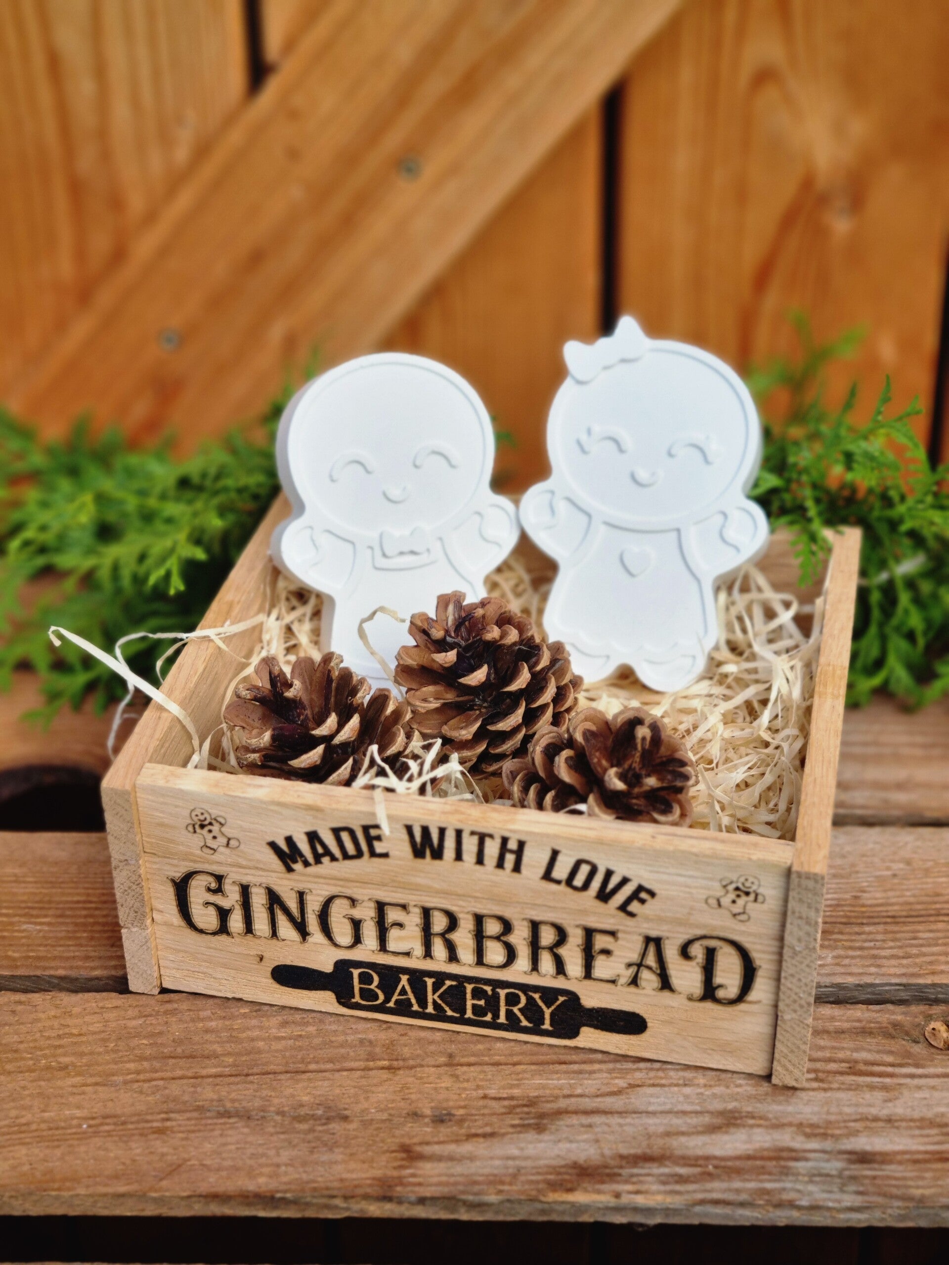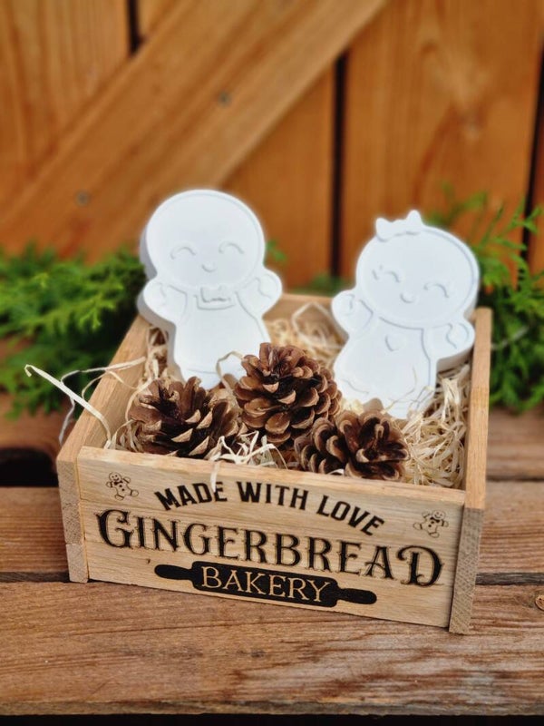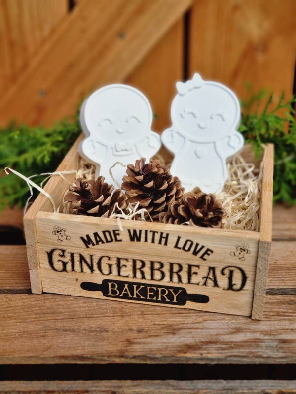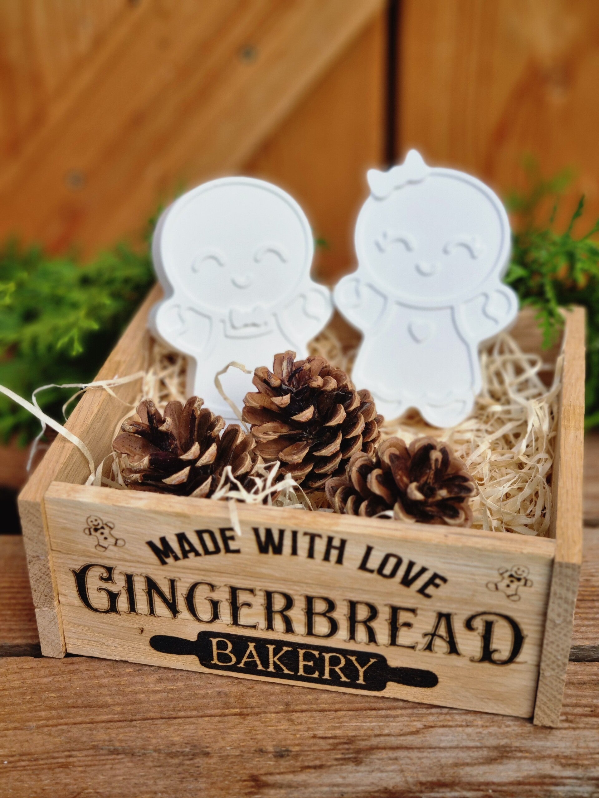 Dieses süße Lebkuchenmännchen Paar gibt es entweder einzeln ,oder im Set in der Rustikalen Holzkiste mit drei Tannezapfen.