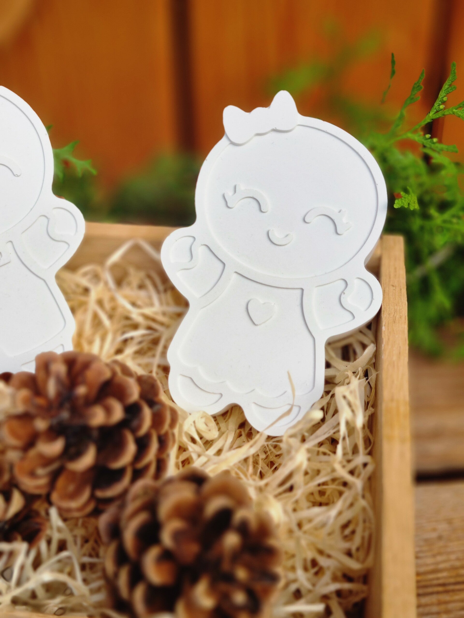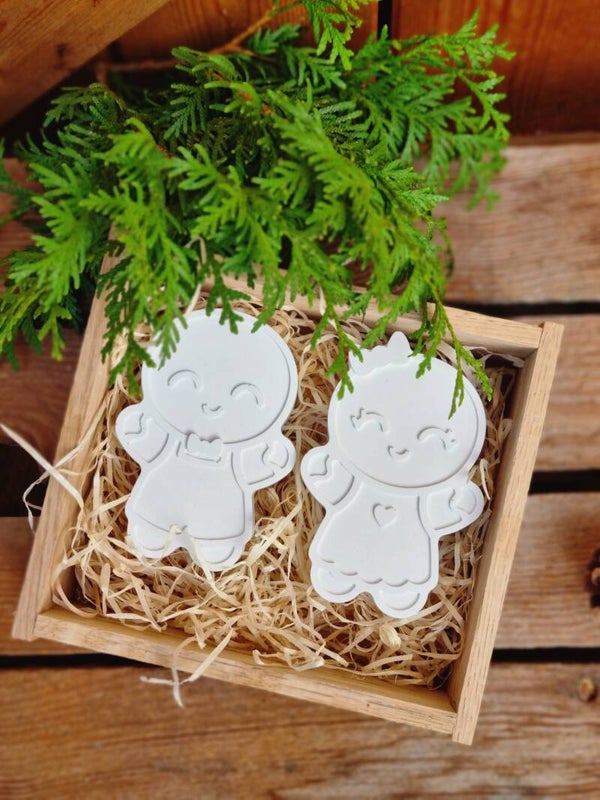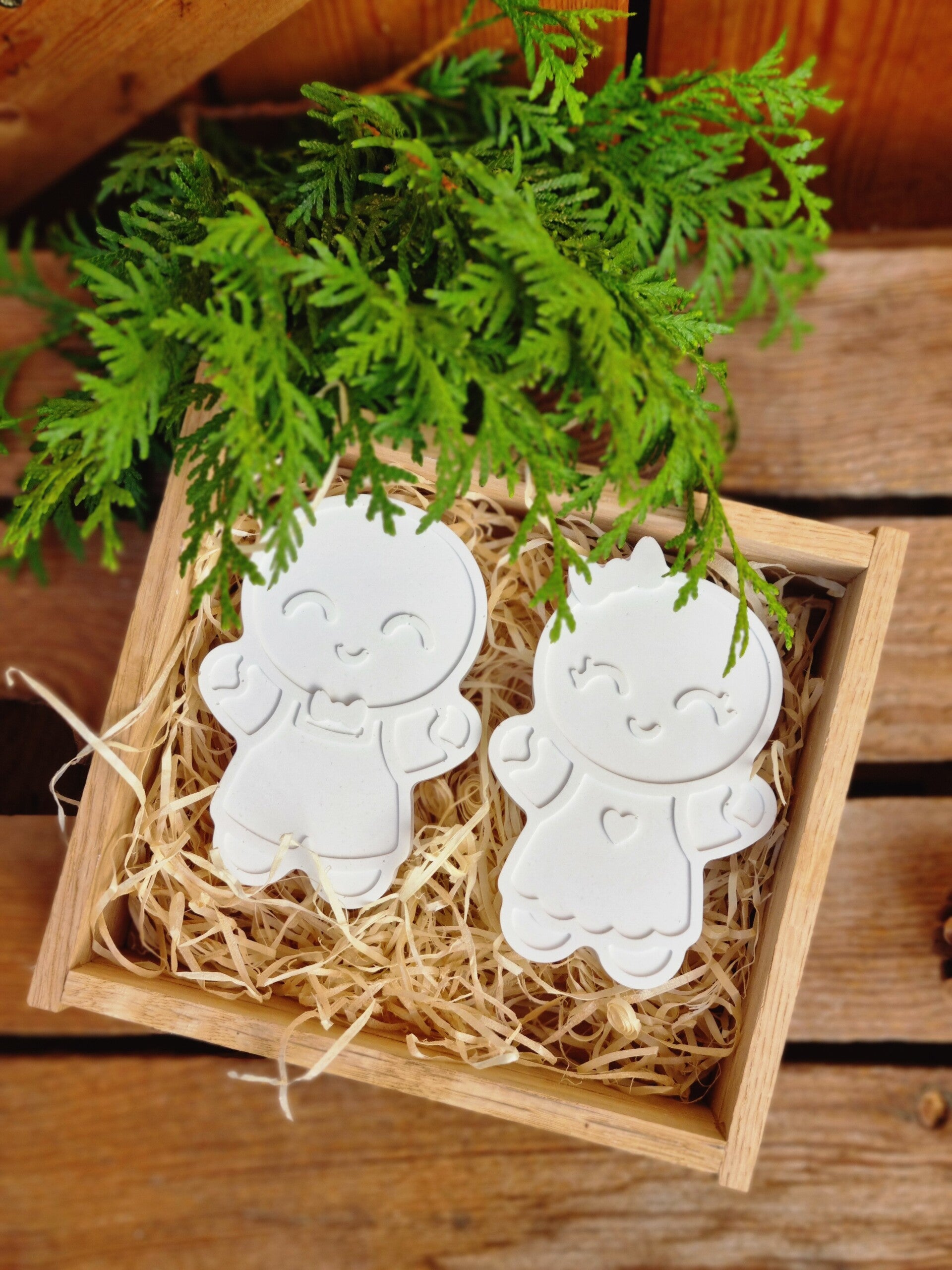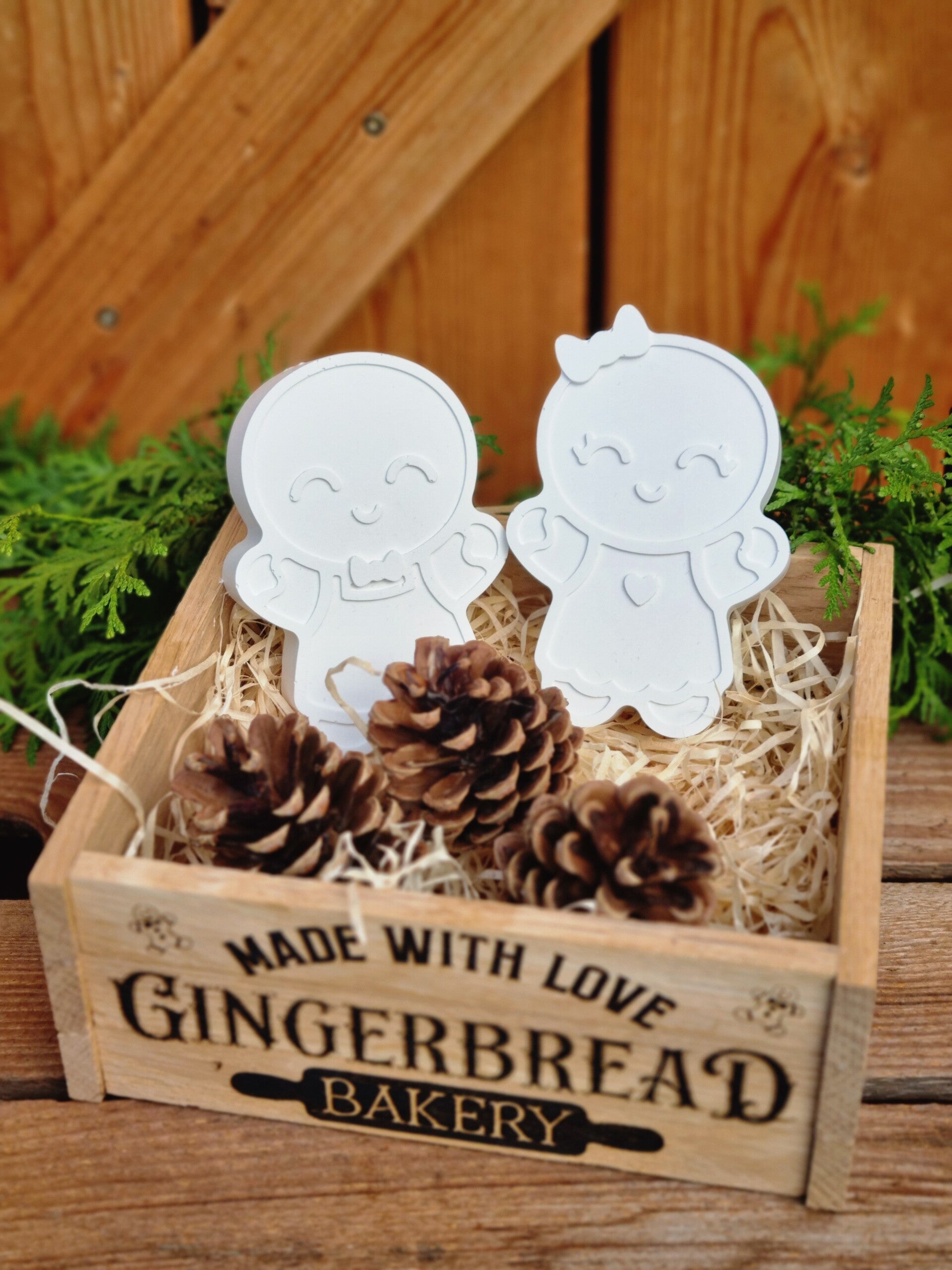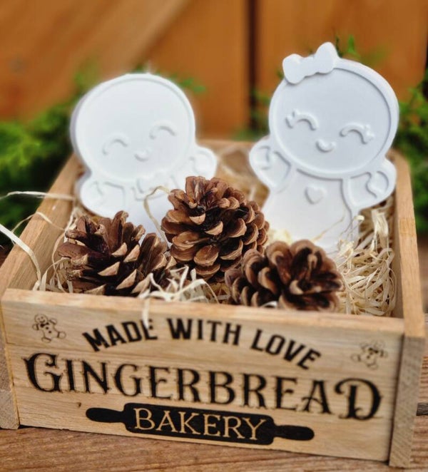 Dieses süße Lebkuchenmännchen Paar gibt es entweder einzeln ,oder im Set in der Rustikalen Holzkiste mit drei Tannezapfen.