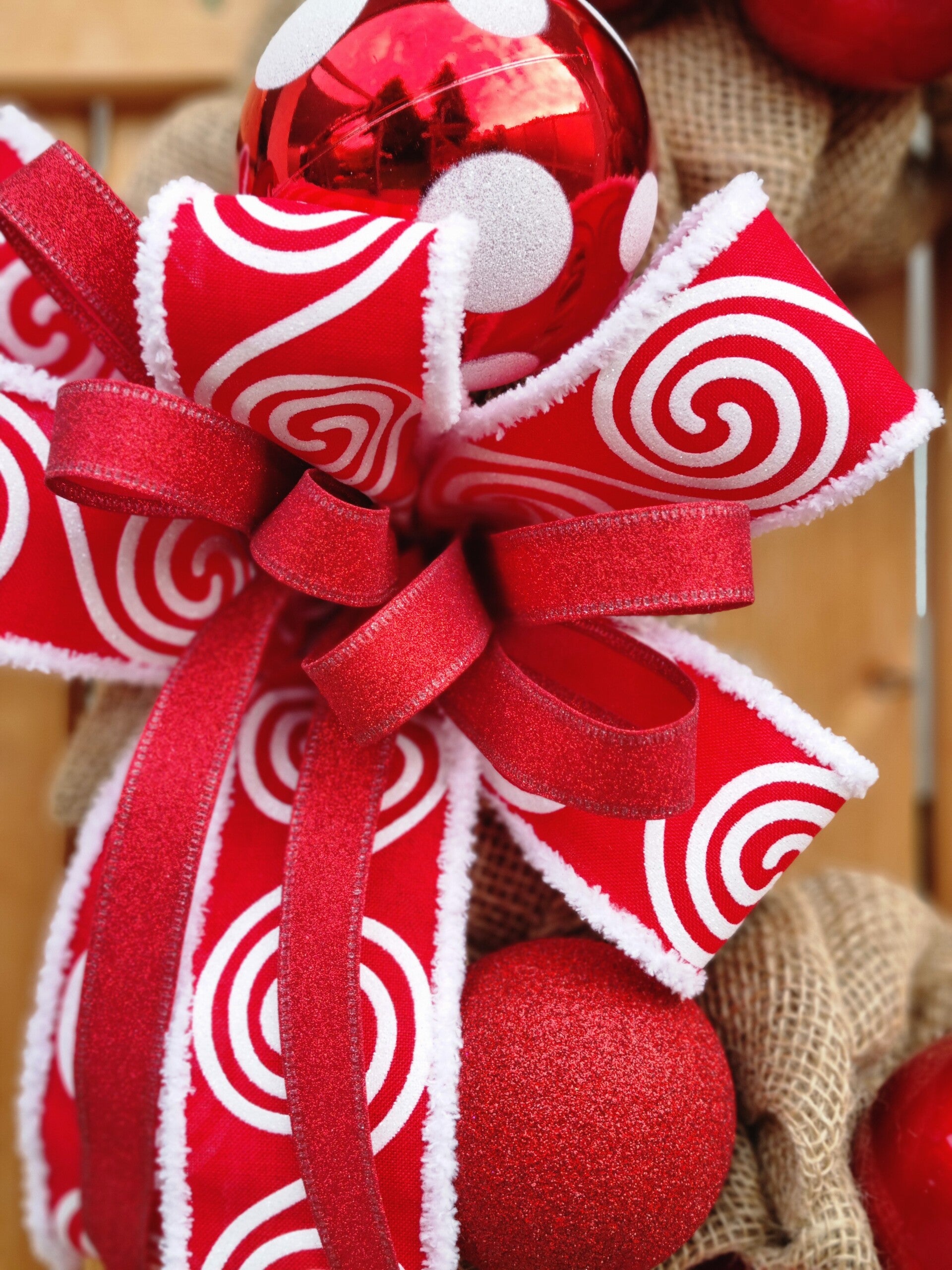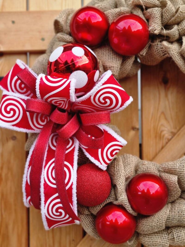Dazu die Weihnachts Baum Kugeln in apple candy look ,glitzer und rot mit weißen Polka Dots ebenso wie die Schleifen Bänder aus den USA .