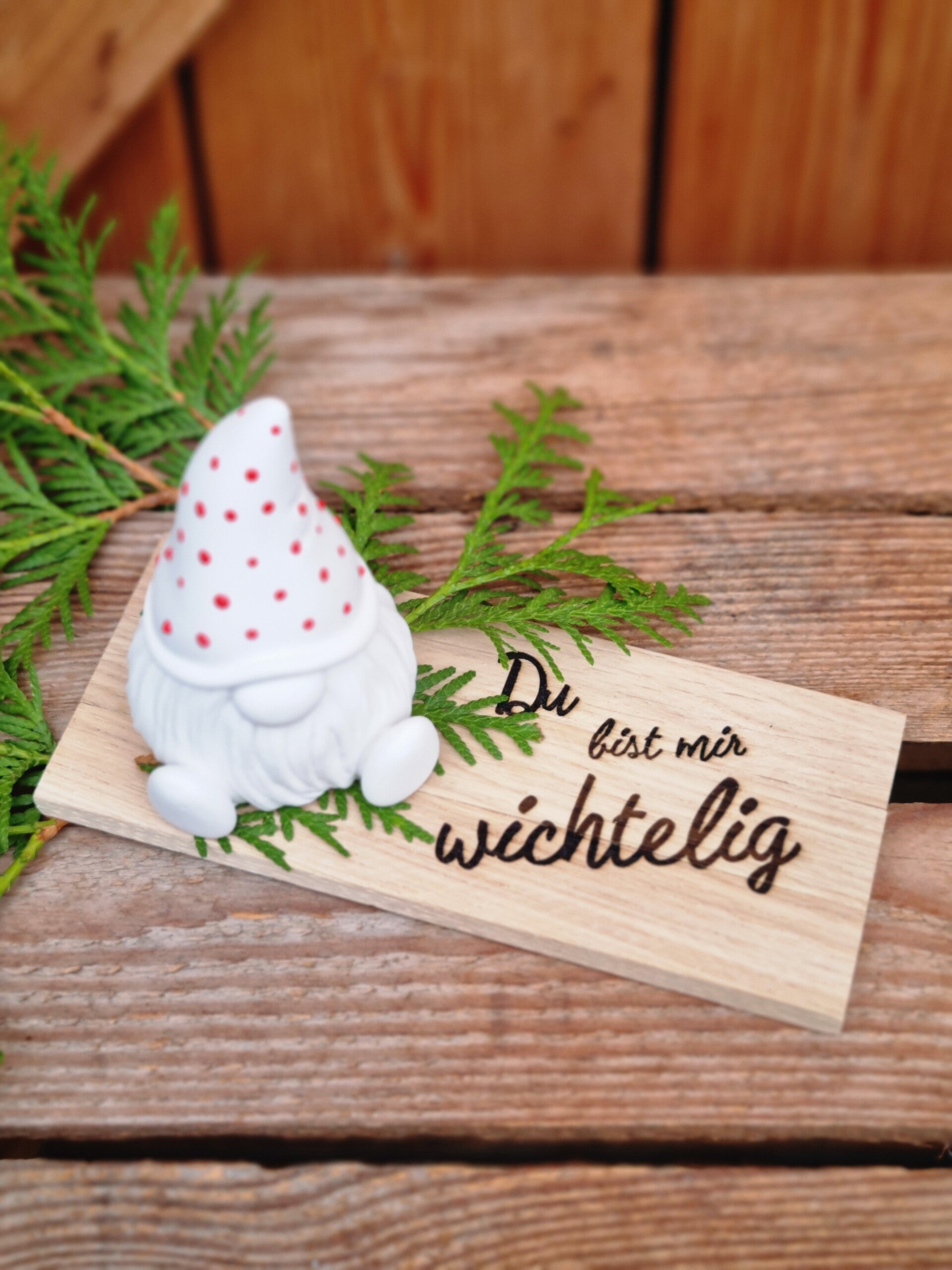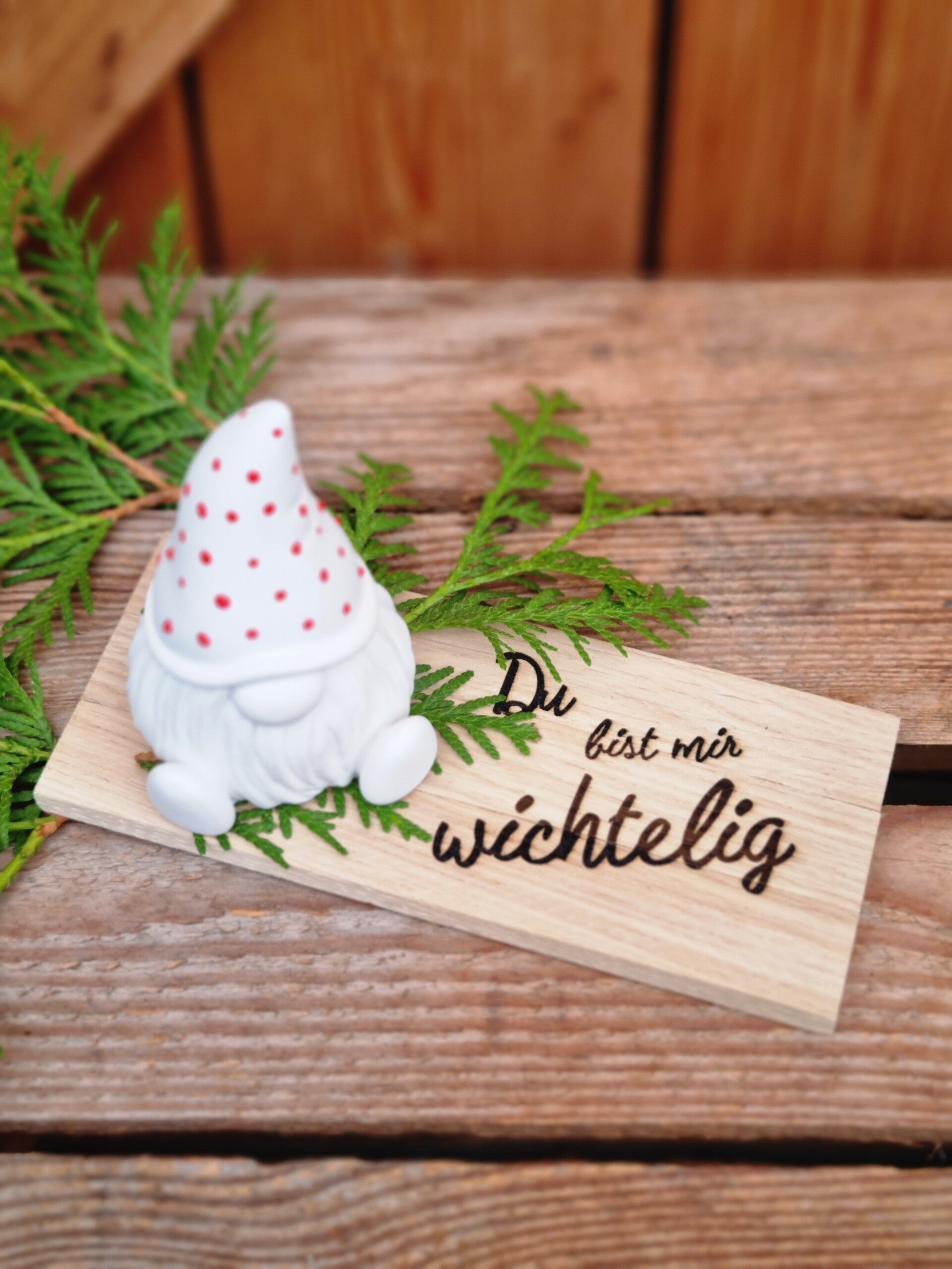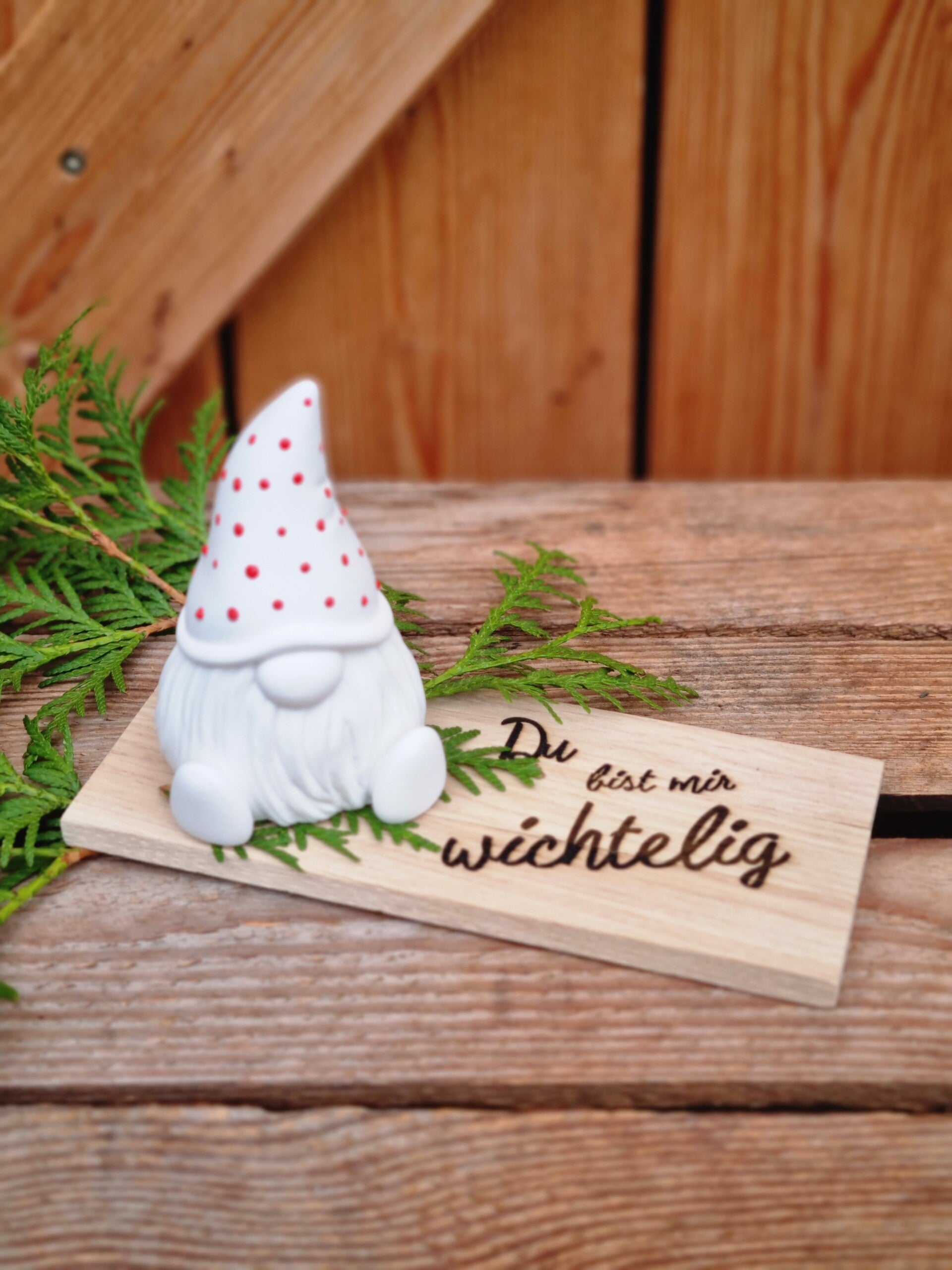 Auf Wunsch kommt der Wichtel auf dem Brettchen als süßes Geschenk mit frischen Tuja Zweigen verpackt.
