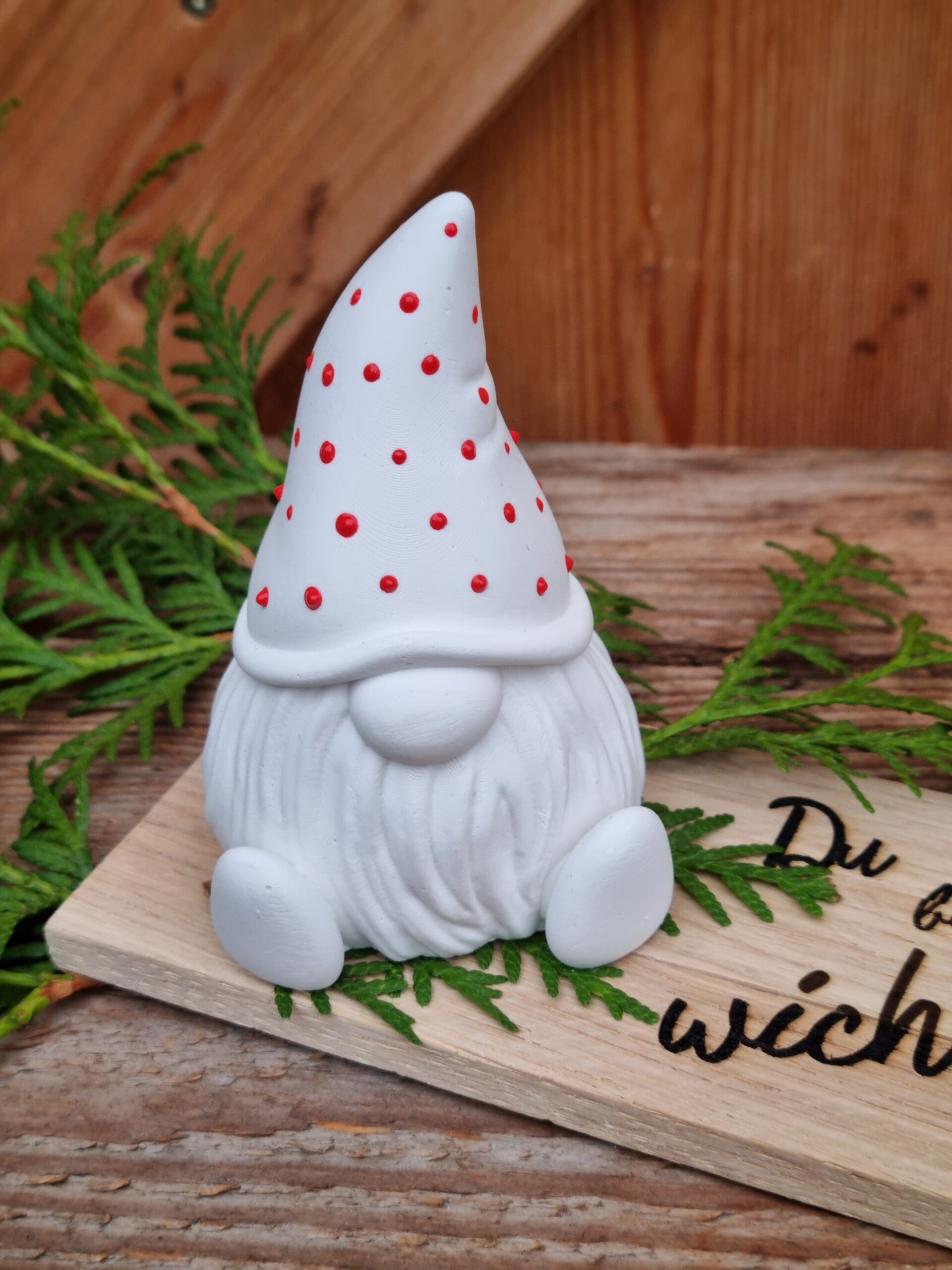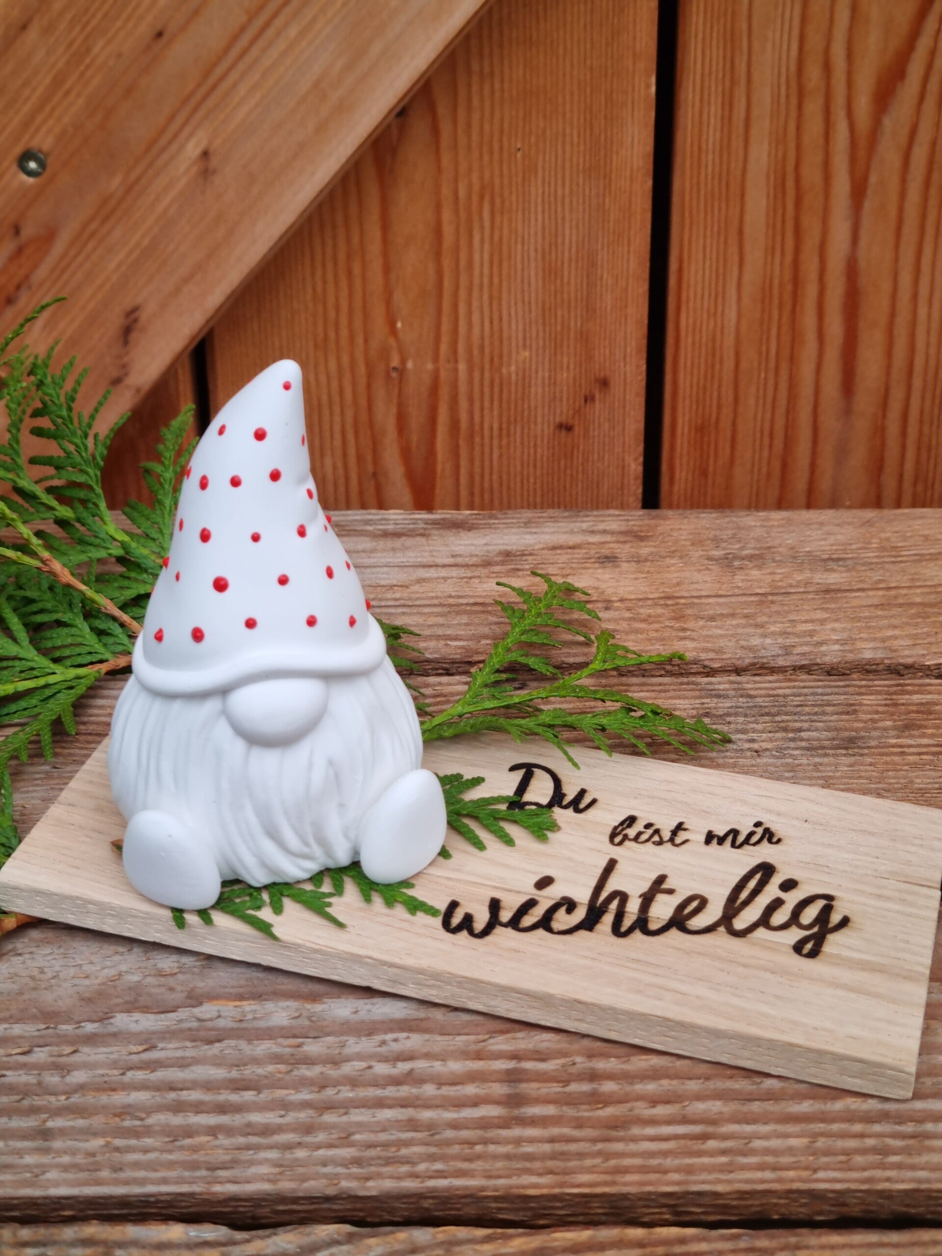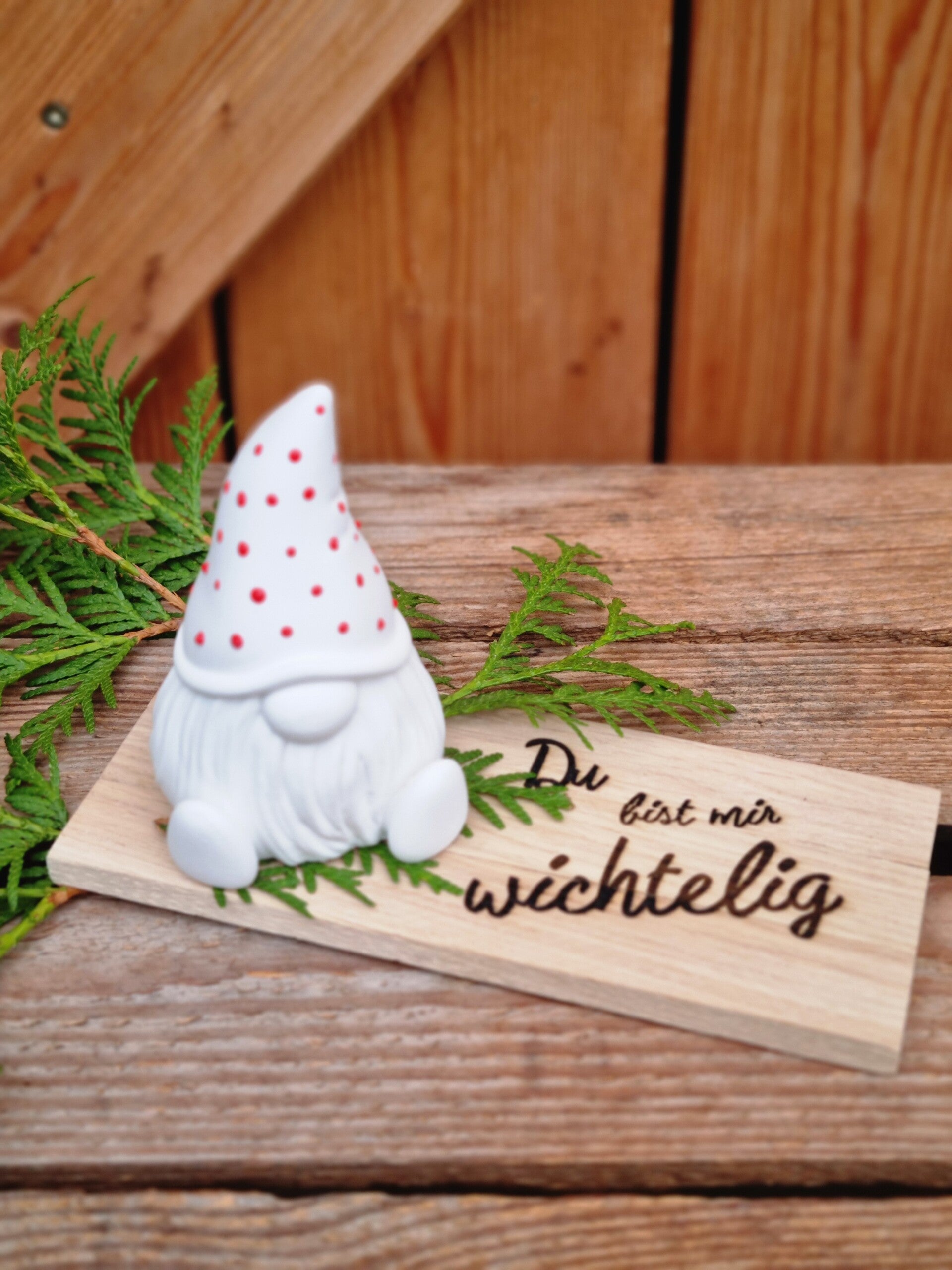 Auf Wunsch kommt der Wichtel auf dem Brettchen als süßes Geschenk mit frischen Tuja Zweigen verpackt.