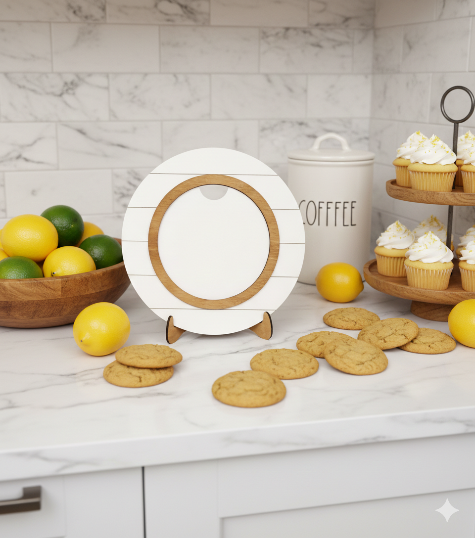 Das Holz Schild befindet sich auf einem losen Holz Ständer , farblich mit der Inlay Umrandung abgestimmt.