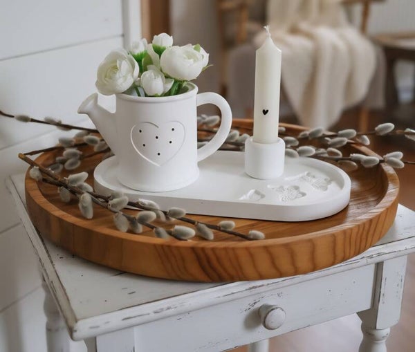 Ein wunderschönes weißes Raysin 200 Tablett mit Schmetterling Prägung, darauf eine kleine weiße Kerze in einem Kerzen Halter und eine Süße Gießkanne mit weißen Ranunkel .