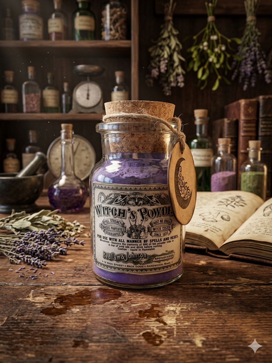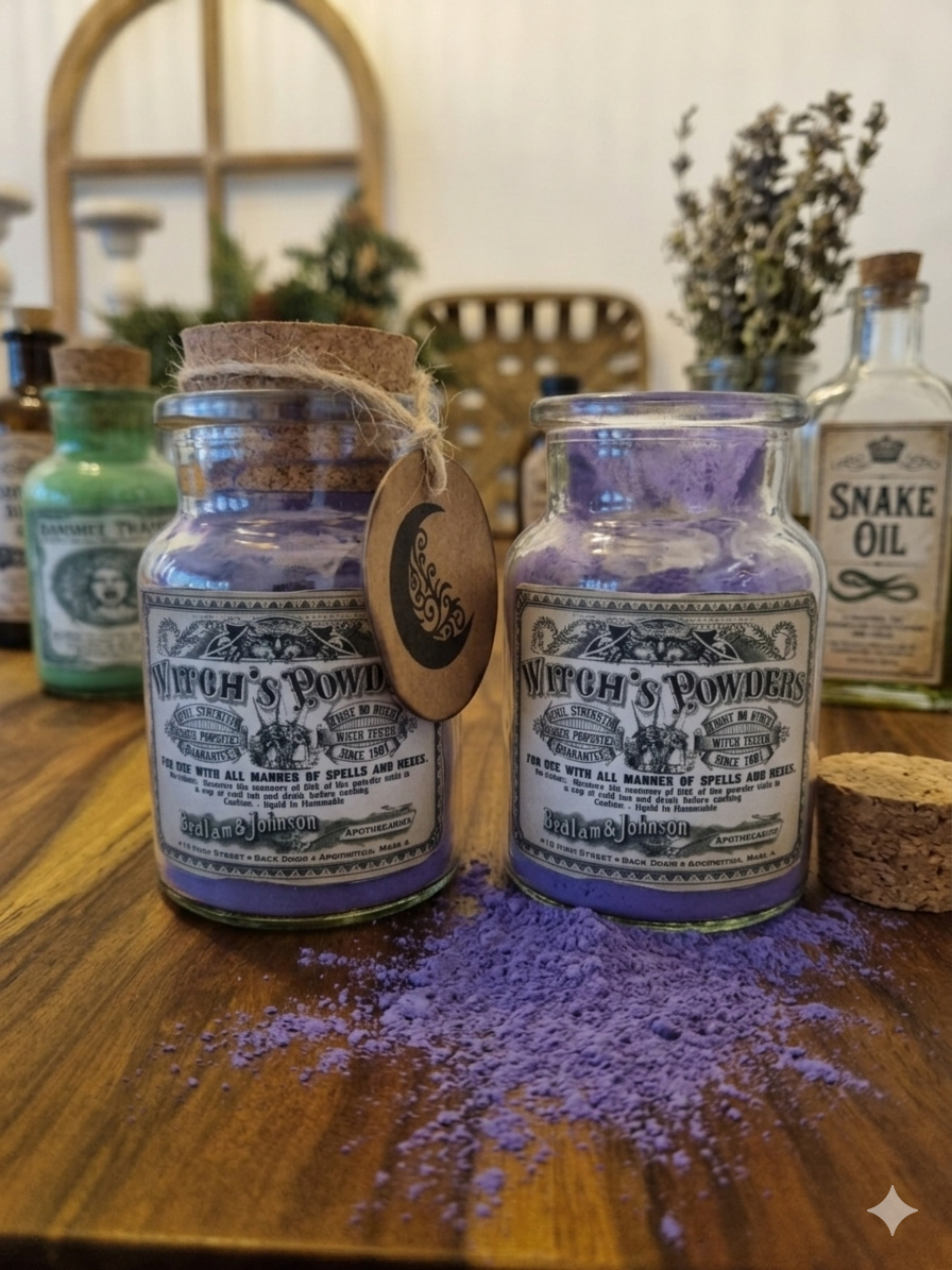 Die Legende besagt, dass Bedlam & Johnson, die Meister-Apotheker des 17. Jahrhunderts, das Geheimnis der "Witch's Powder" auf ihren Reisen durch verzauberte Wälder und längst vergessene Ruinen entdeckten. Sie sammelten die feinsten Kräuter und Essenzen bei Neumond, wenn die Schleier zwischen den Welten am dünnsten sind, und verarbeiteten sie mit alchemistischer Präzision zu diesem feinen, violetten Pulver. Die Farbe des Pulvers, ein tiefes, sattes Violett, symbolisiert die Verbindung zum Göttlichen, die Intuition und die Fähigkeit, die Zukunft zu ergründen.