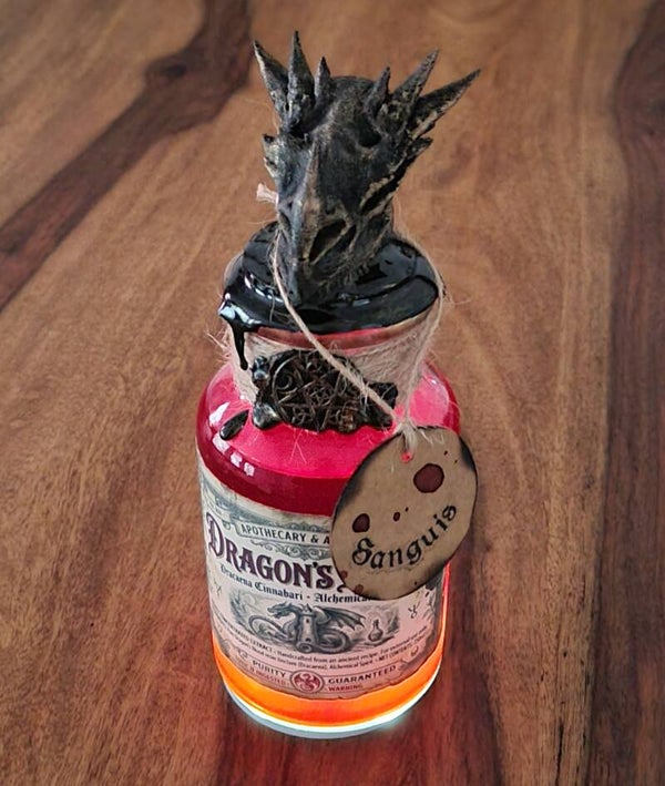 Drachenblut Alchemie-Flasche – Handgefertigte Fantasy Deko mit LED-Licht & Drachenschädel – 250ml Unikat.