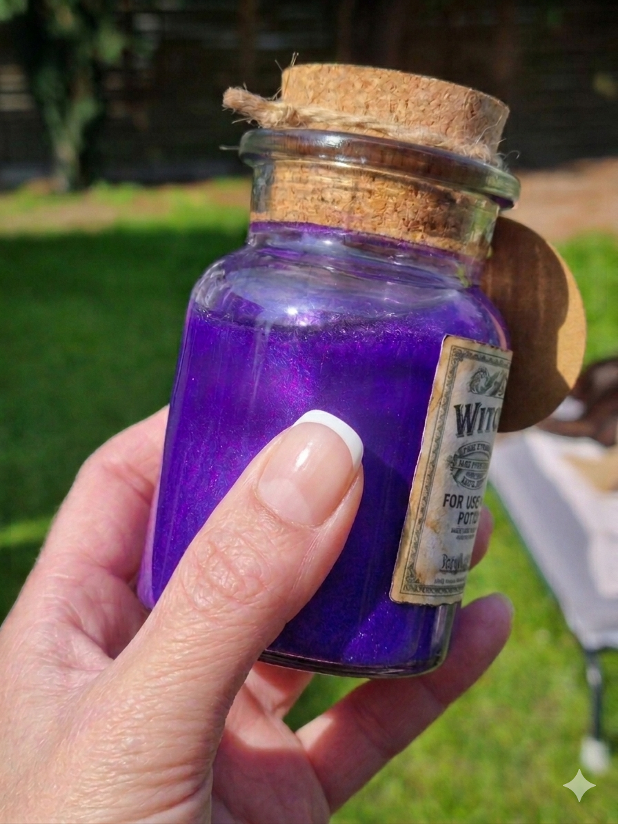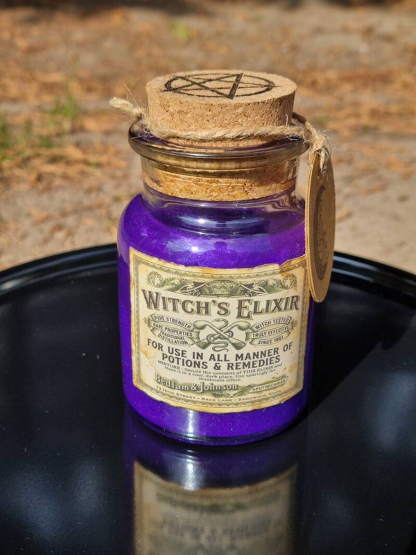 - Mystisches Label: Aufwendig gestaltetes „Witch’s Elixir“ Etikett im Antik-Look mit feinen Details und alchemistischen Symbolen.